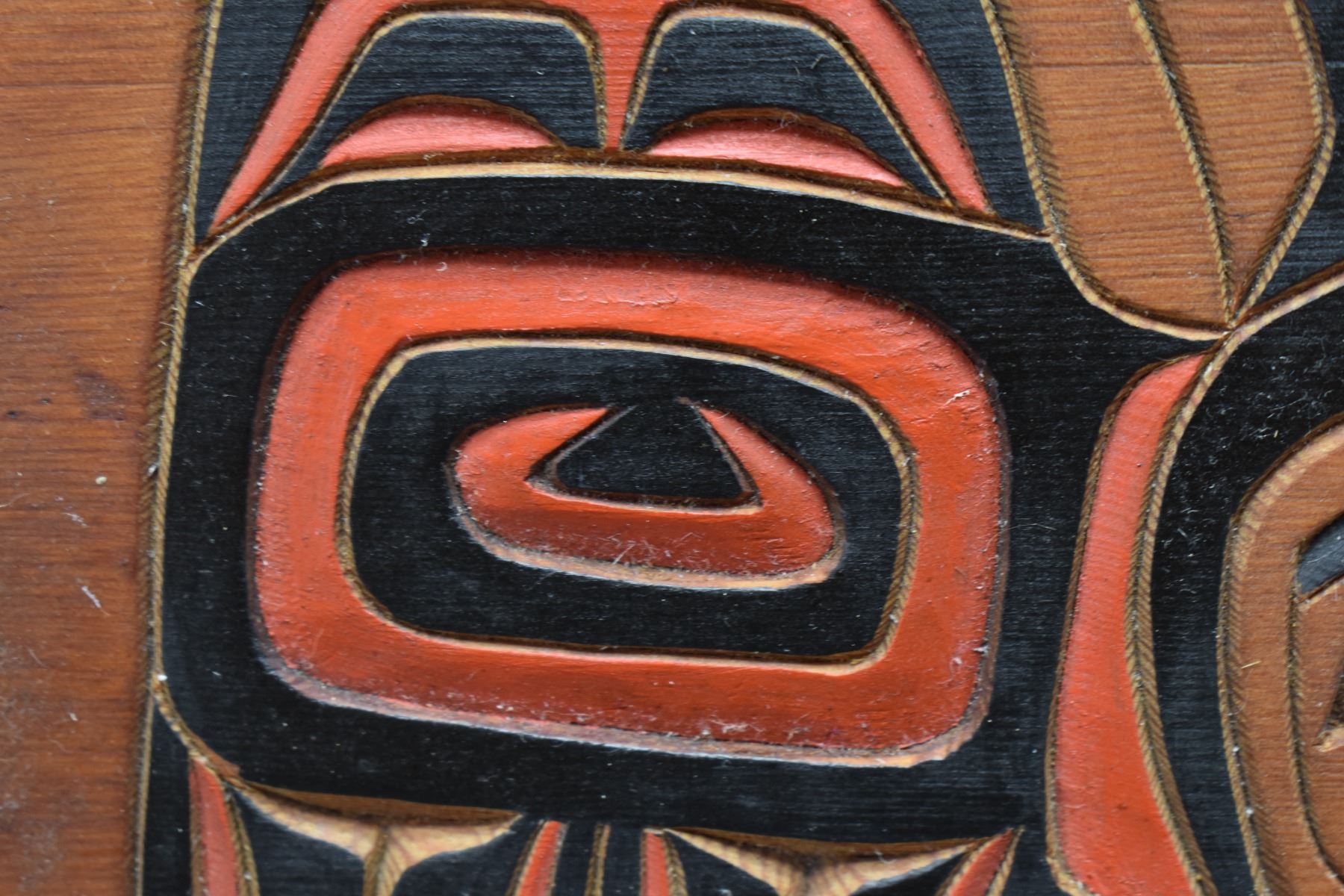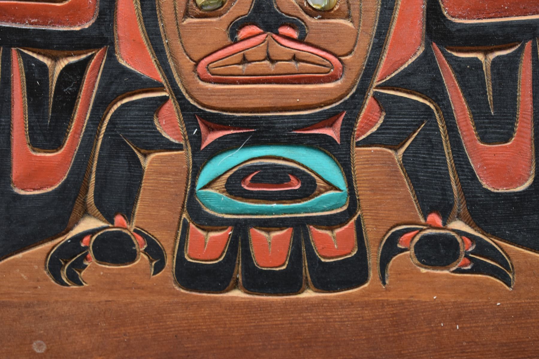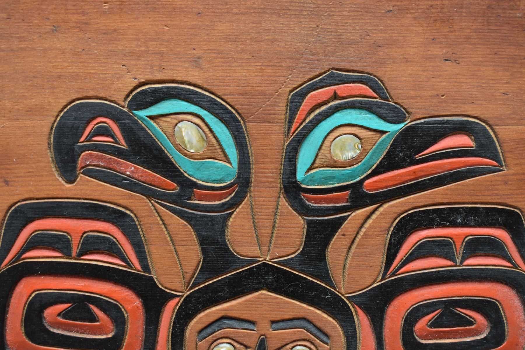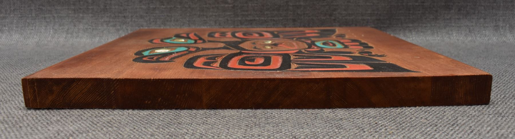 1970-80's Tlingit Indian hand carved and painted with abalone inlay titled "love Birds" signed Rick Horton 11.25" x 10.75"