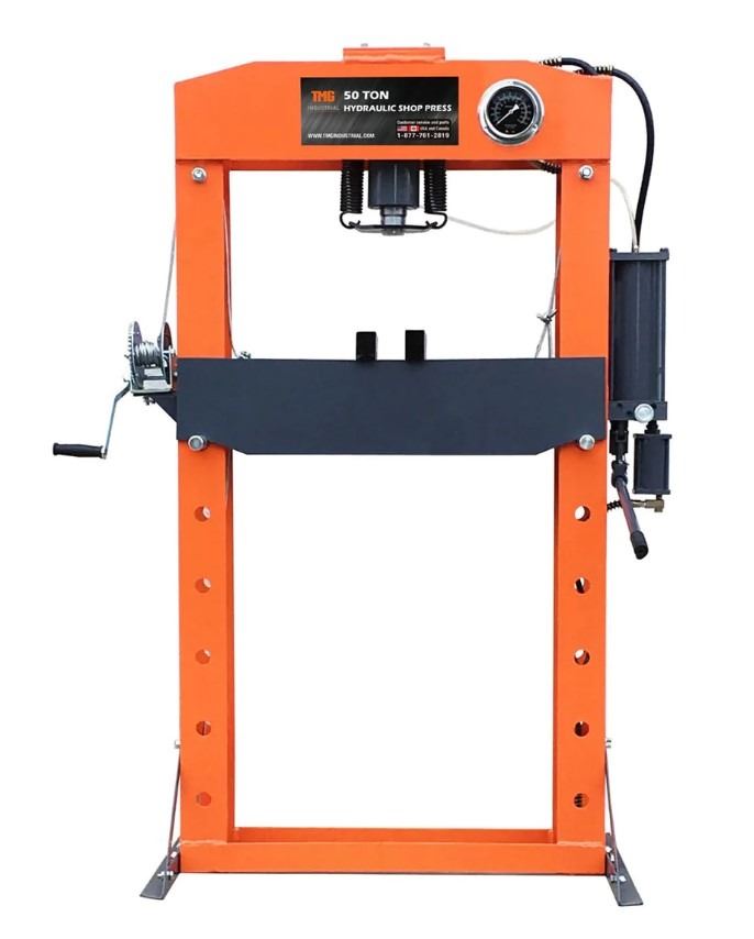 INDUSTRIAL 50 TON CAPACITY HYDRAULIC SHOP PRESS, HEAVY DUTY PRESSING, FULLY WELDED H-FRAME, AIR & MANUAL DUAL OPERATION, TMG-SP50