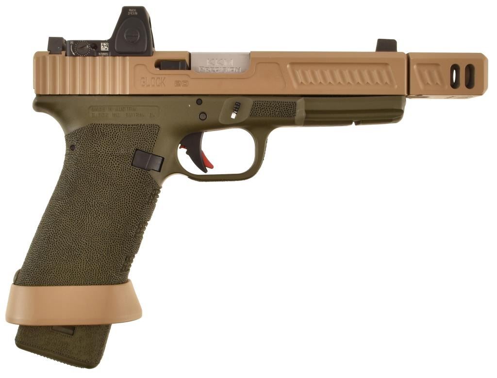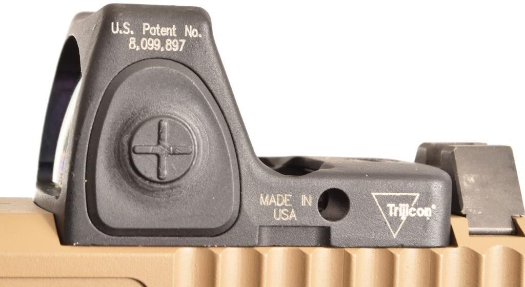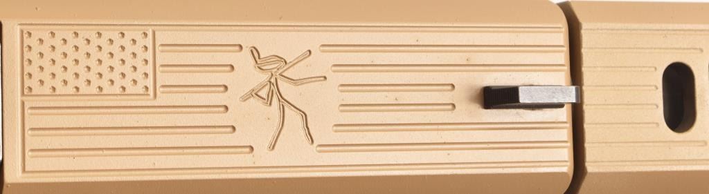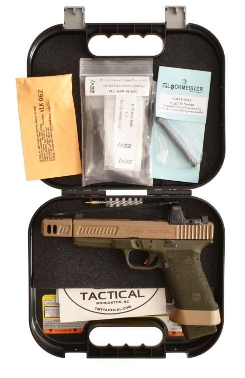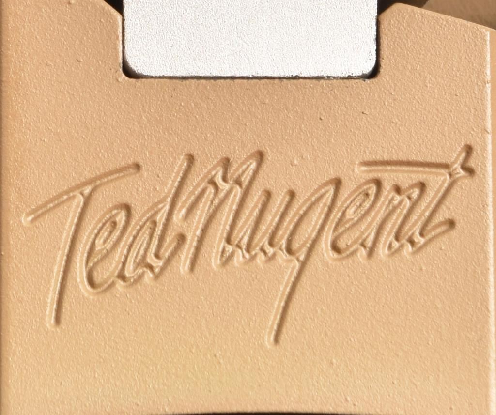American flag, Spirit Of The Wild Stickman and "Ted Nugent." stamped on top of slide. KKM Precision barrel. TMT Tactical flash suppressor, custom grip with Arredondo extended magazine. In original box, with spare ZEV Striker spring kit. Trijicon sight
