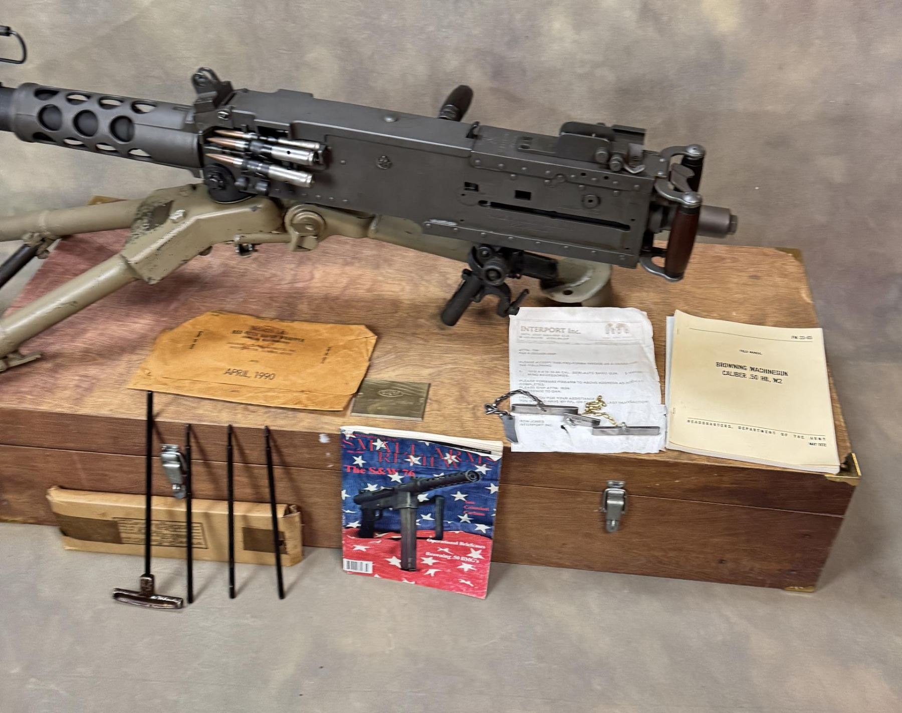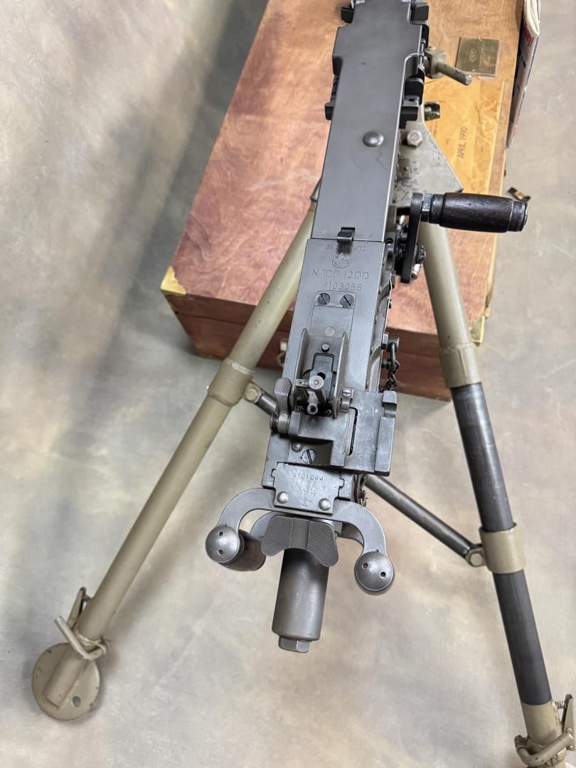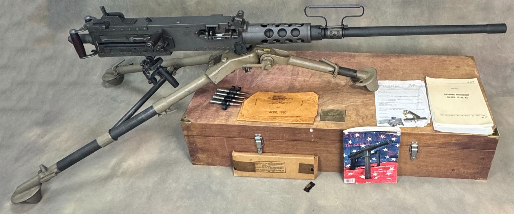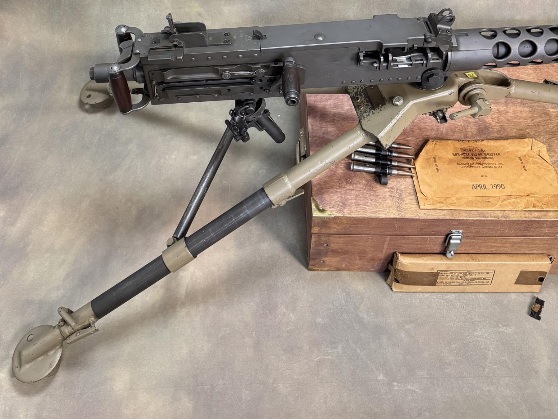 Includes nice wooden carrying case, and WW2 M3 tripod. Requires FFL Transfer. No sales to the following areas, a bid from any of these restricted areas will result in immediate termination of your agility to place bids with our auction company in perpetuity: California, Connecticut, Colorado, Delaware, Washington DC, Illinois, Hawaii, Maryland, Massachusetts, Washington State, New Jersey and New York.