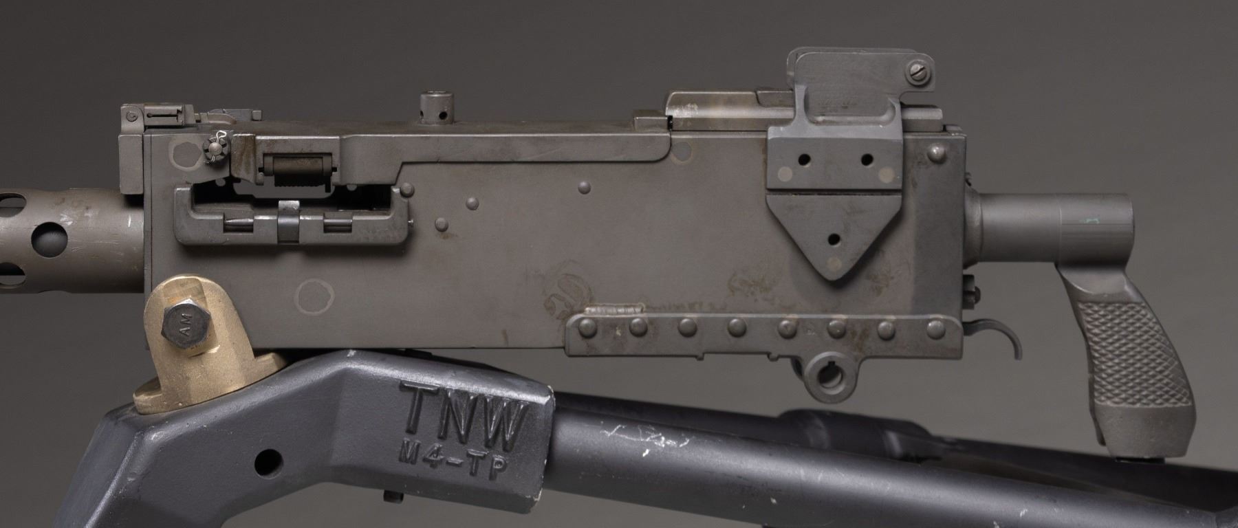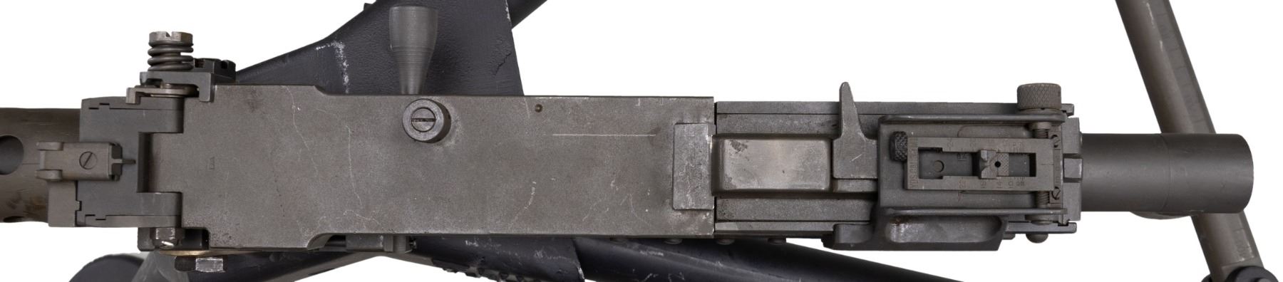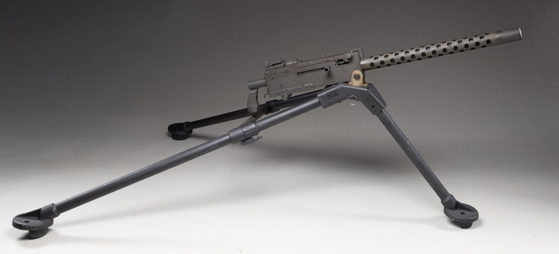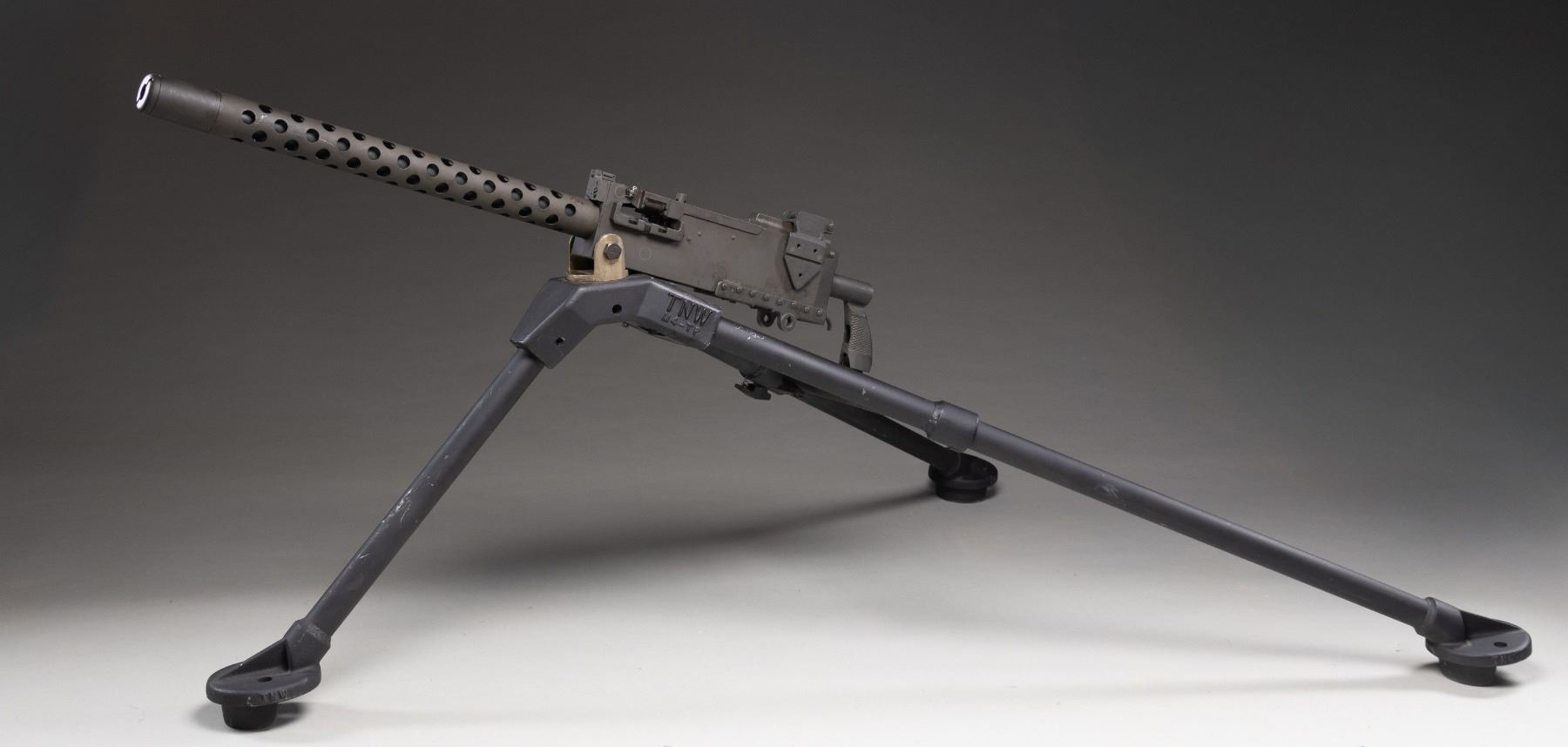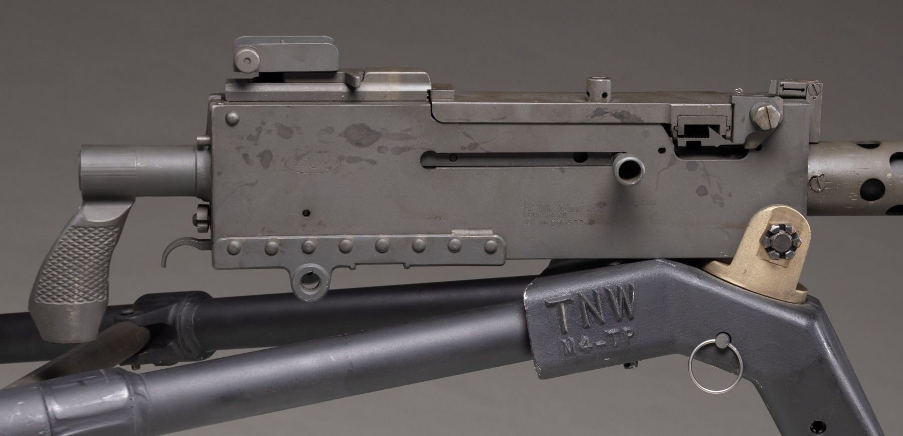Cal. 30. S#.000539. Bbl. 24". There aren't many firearms from the military past of the United States that are as recognizable as the rectangular receiver & perforated barrel shroud of the Browning model 1919. In order to own a legal machine gun there are fees & a fairly lengthy amount of paperwork that aren't necessary for traditional, Title I firearms like hunting & target rifles. This particular Browning was manufactured by TNW & based on the war proven, original, as a functional semi auto only. This gives you the opportunity to own such an exciting piece of history w/ out the extra time & expense. This firearm transfers just like any other semi auto firearm. Rear of the iconic, circular vented barrel shroud is the front sight, a folding post, w/ an elevation adjustable ladder rear sight, marked out to 2400 yards. It may be fired utilizing a 1919A6 style bipod (not included) or mounted to a tripod w/ the proper cradle assembly. It currently appears to be chambered in 30-06. Common chamberings for this system can include 7.62 NATO, 8 mm Mauser & U.S. 30-06. Parkerized finish on all exposed metal surfaces. Right sideplate markings include: "U.S. GOVERNMENT / MODEL M1919 A4/A6 / CALIBER .30 SEMI AUTO / VERONA OR / SER. NO. 000539". Mounted on lightweight TNW M4-TP tripod. CONDITION: Parkerized finish on exposed metal surfaces retain full coverage, though display scattered patina & period correct staining under close inspection. Everything appears functional & correct though unable to confirm through live fire. Bore shows evidence of some heavy fouling though still retains strong rifling. Tripod is very nice w/ some finish thinning in areas of mechanical intervention though it is smooth in all operations. Fire control mechanism appears to function correctly when cycled by hand. (25-3915/JZ). MODERN. $2,500-$4,000.