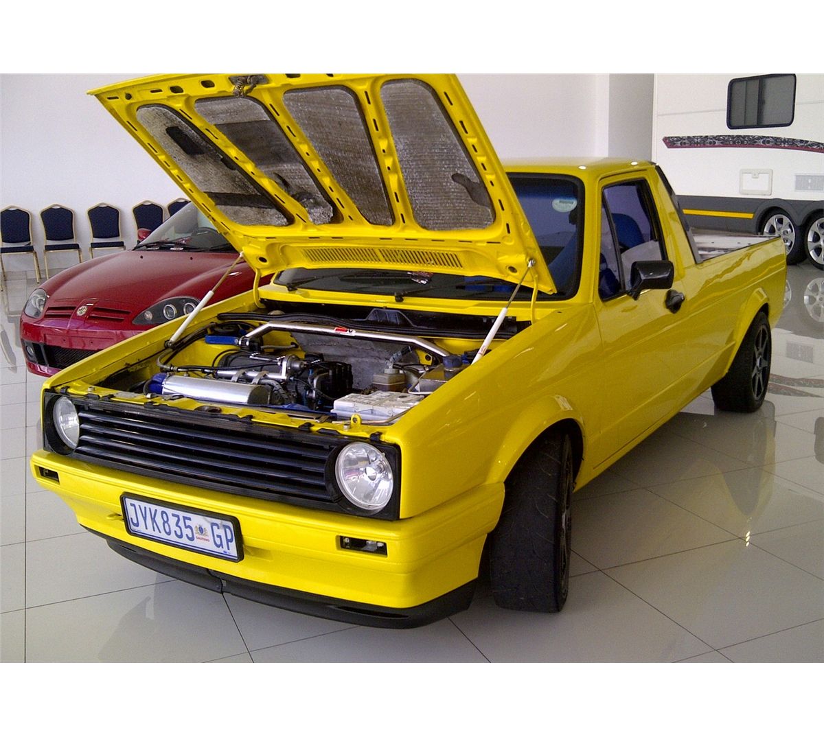 Make: Volkswagen Caddy Bakkie, Year: 1992, Colour: Yellow, Interior: Black with Bucket seats, Mags: ?, Motorplan: n/a, Features: Semi-slicks; Close radio/cable shift box; Hydrolic clutch/Non-button; Bucket seats and custom clocks; 2.3 pistonsand 1800 block and app's; Branches and pipes; 4×4 throttle body; lower comp; 16V head; turbo;Stock brances; Injectors; Fuel pump; Cooler/pipes; Head gasflow; STK 300° cam; 4-2-1 Ex; MRK 2 front susp; VDO g-set; Right hand drive