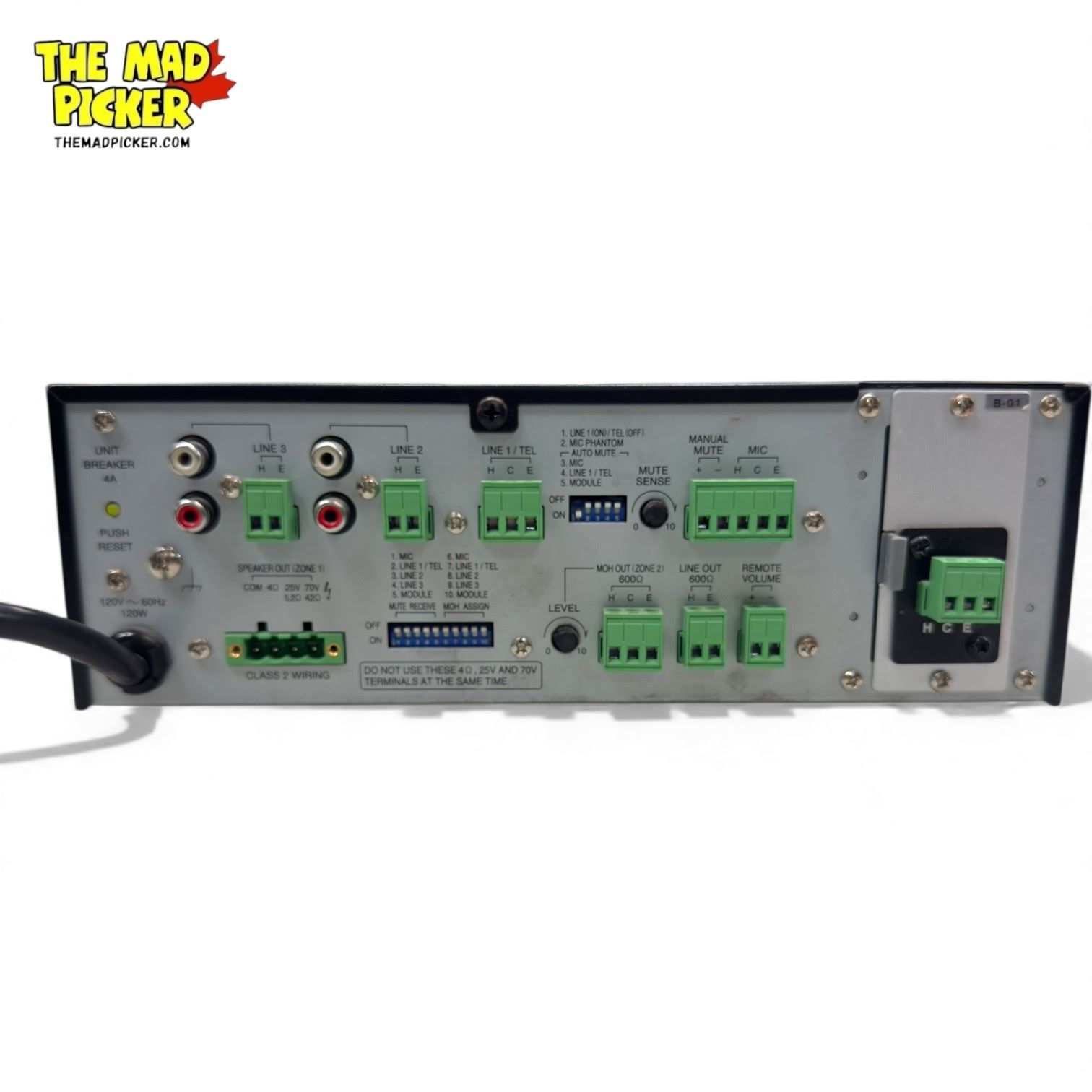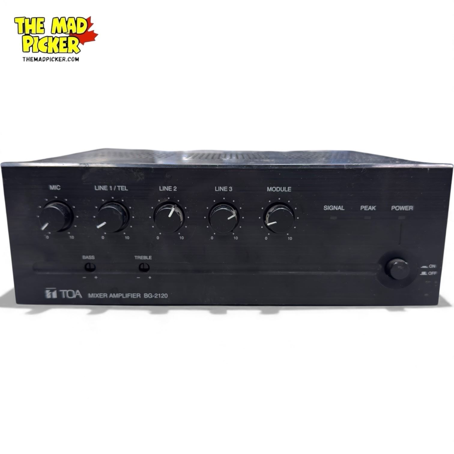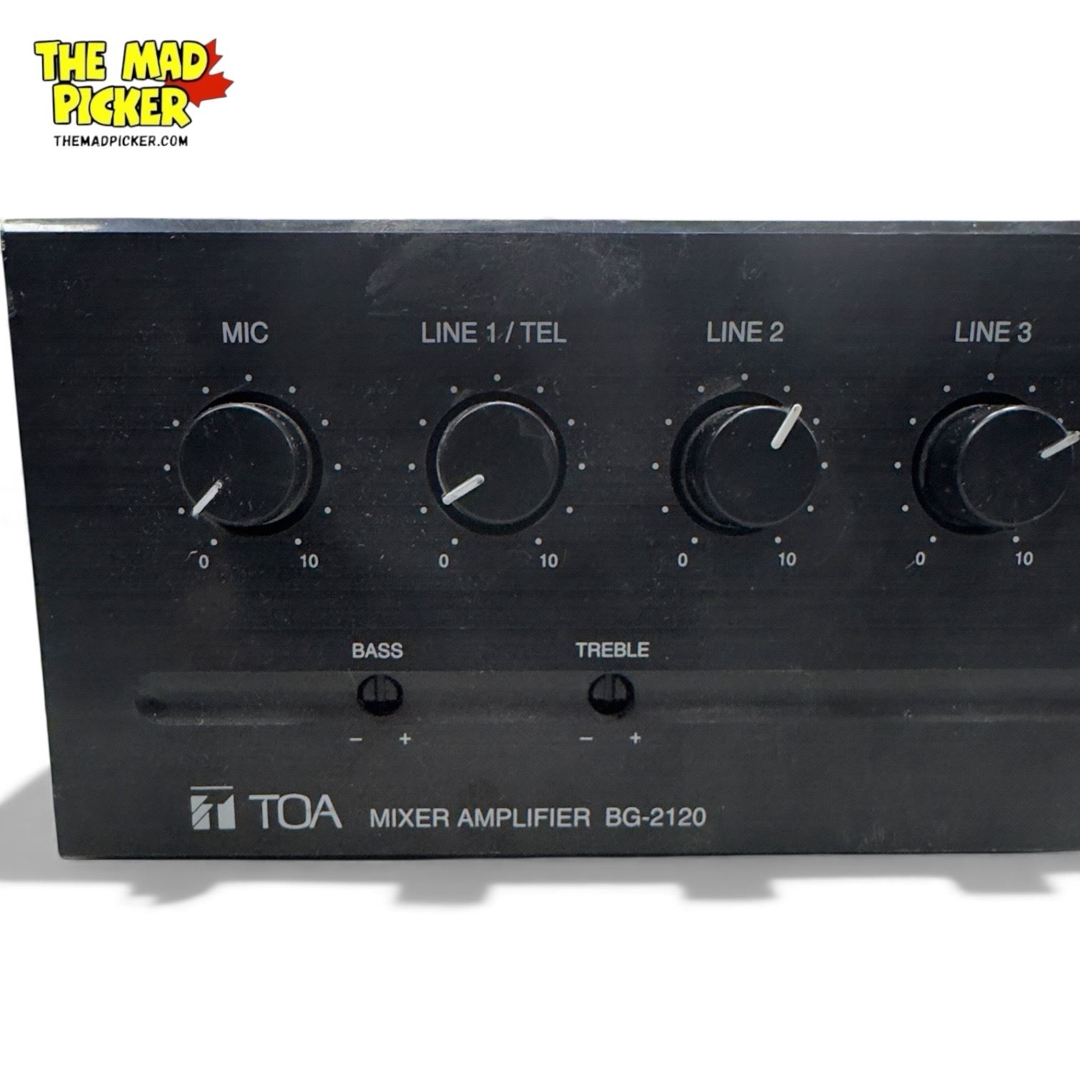 The TOA BG-2120 is a 120W RMS mixer amplifier designed for background music and paging applications. Specifications: Inputs: 4 built-in (Mic, Line 1/TEL, Line 2, Line 3) plus 1 modular slot for TOA plug-in modules; Outputs: speaker outputs 70V, 25V, 4Ω, plus MOH (Music on Hold) / Zone 2 output for dual-channel broadcast; Frequency response 50Hz–20kHz, THD ≤0.5% at rated output; Controls: bass and treble recessed knobs, automatic/manual mute with adjustable sensitivity, rear DIP switches for input assignment, mute settings, phantom power, and Line/TEL level; Phantom Power: +24V DC switchable for Mic input; Connections: removable input/output terminal blocks, RCA jacks for line inputs; Design Features: supplied volume control covers (tamper-proof), rack-mountable chassis, expandable with optional booster