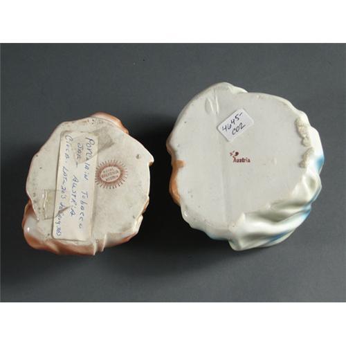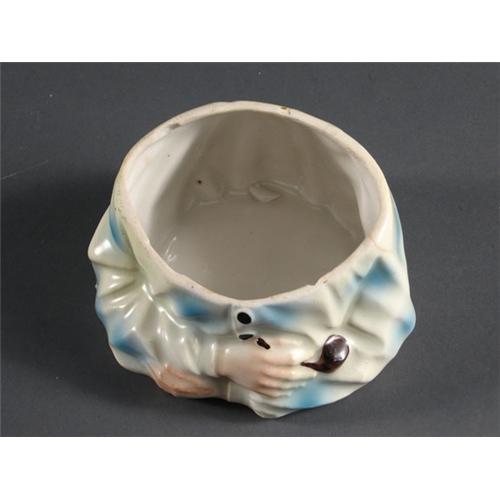 TOBACCIANA:  Two Austrian porcelain tobacco jars or humidors. The first is in the form of a harlequin with a wide ruffle collar, blue polka dot hat, holding a pipe, marked ''Austria 42'' on underside, 7'' x 4 1/2'' x 4'', two chips noted and a hairline crack noted to interior rim.  The second is a round belly man with a black top hat and pipe, 5 1/4'' x 4 1/2'' x 3'', hallmarked ''Royal Bruxonia, Austria'', on underside, some wear to paint noted on tophat and lid rim noted, circa 1920's-'30's.