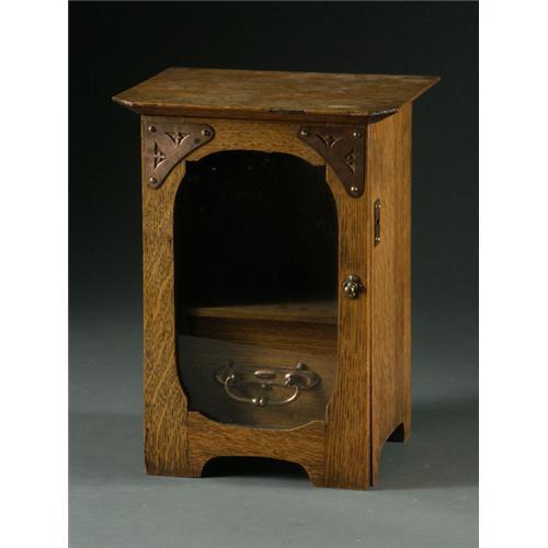 MINIATURE OAK CABINET/TOBACCIANA: A small Arts and Crafts style pipe cabinet, oak with glass front, small drawer, copper fittings, 10 3/4'' x 8'' x 6 1/2'', some nails missing from interior hinges, and no key.