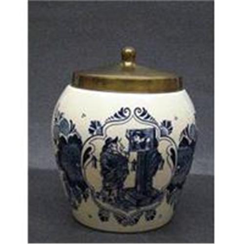 LOVELY TOBACCO JAR OR HUMIDOR, MADE BY DELFT OF HOLLAND, SIGNED ON THE BOTTOM:" V R DELFT'S",ALL DECORATIONS ARE DONE IN TYPICAL DELFT BLUE,ON THE BACK OF THE HUMIDOR THERE IS DOCUMENTATION IN WRITING, AND THE LID IS MADE WHAT IT LOOKS LIKE BRASS,AND IT SEEMS THAT IT HAD A CORK OR "SPONGE" INSULATION, IT DOES NOT NOW - as per images - EXCELLENT CONDITION, It stands about 11 1/4" high, US Buyer to pay 9.00, for shipping plus insurance.THANKS.