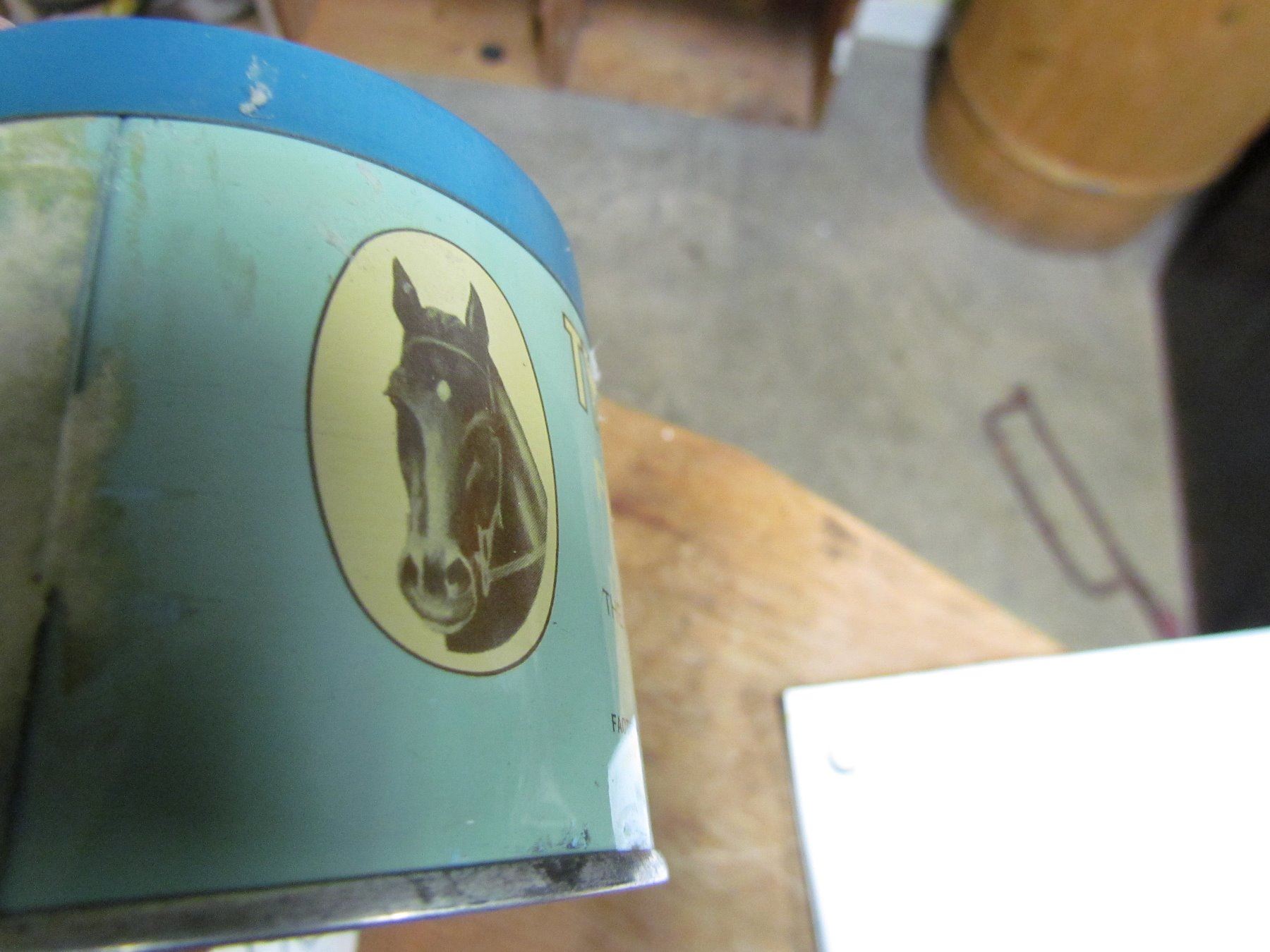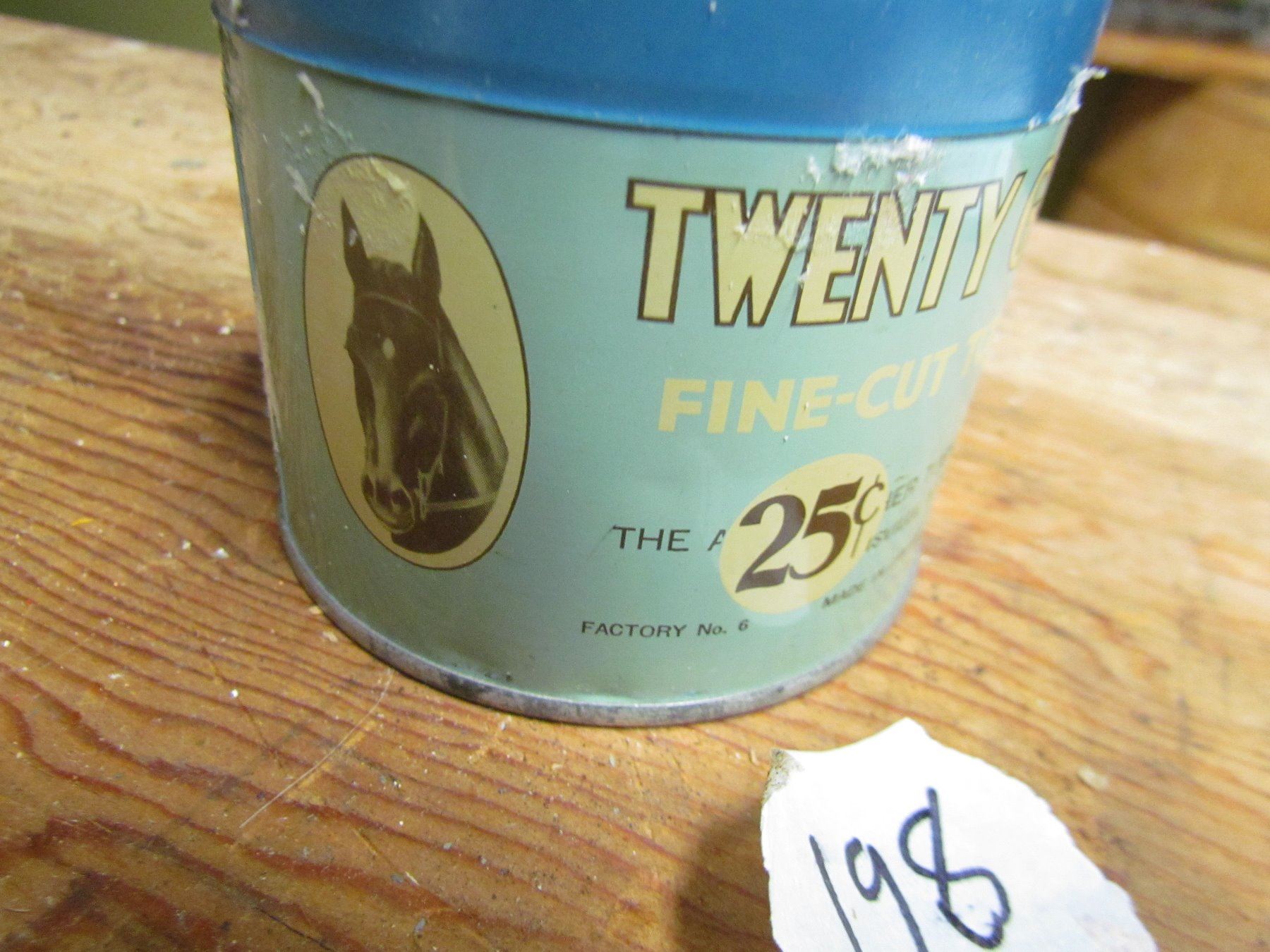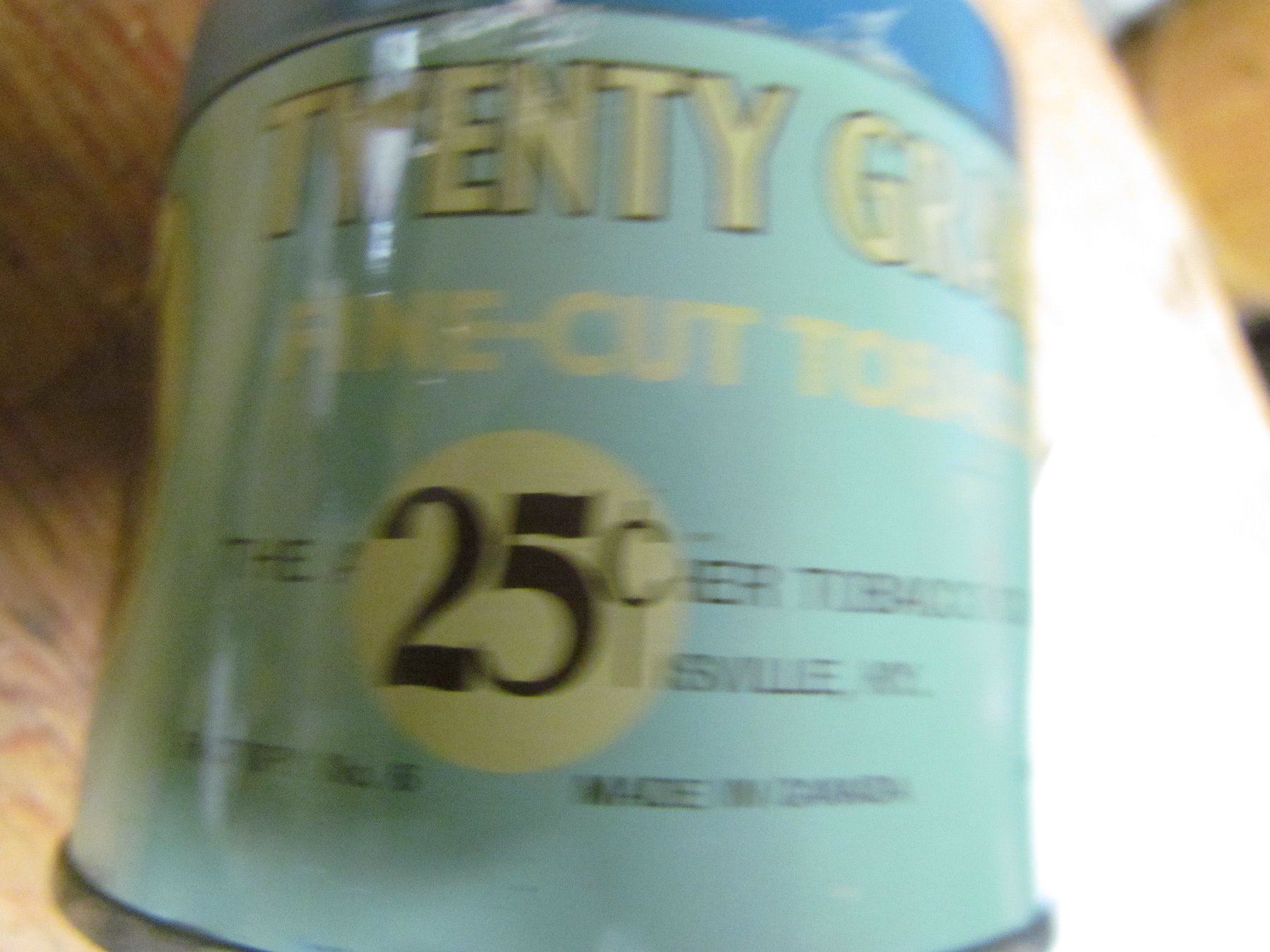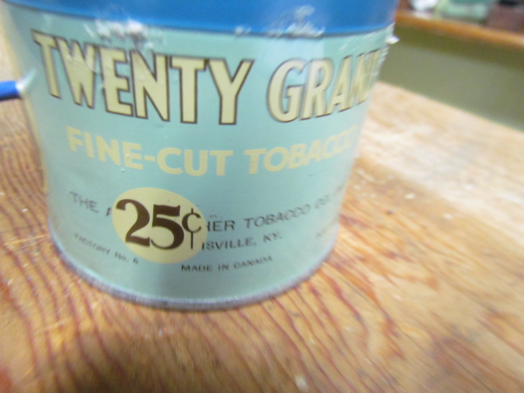 TOBACCO TIN (TWENTY GRAND 25 CENTS) *LID HAS HOLES*, 3" TALL, 3.5" ACROSS, NICE GRAPHICS*