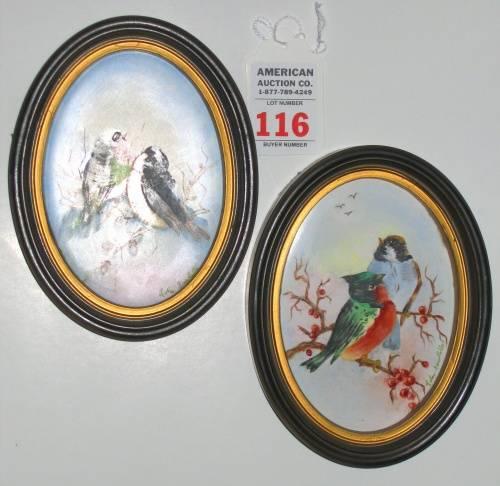 Lovely pair of turn of the century oil on porcelain paintings depicting song birds. Oval, framed 7"x5" overall. 3lbs (5-116)