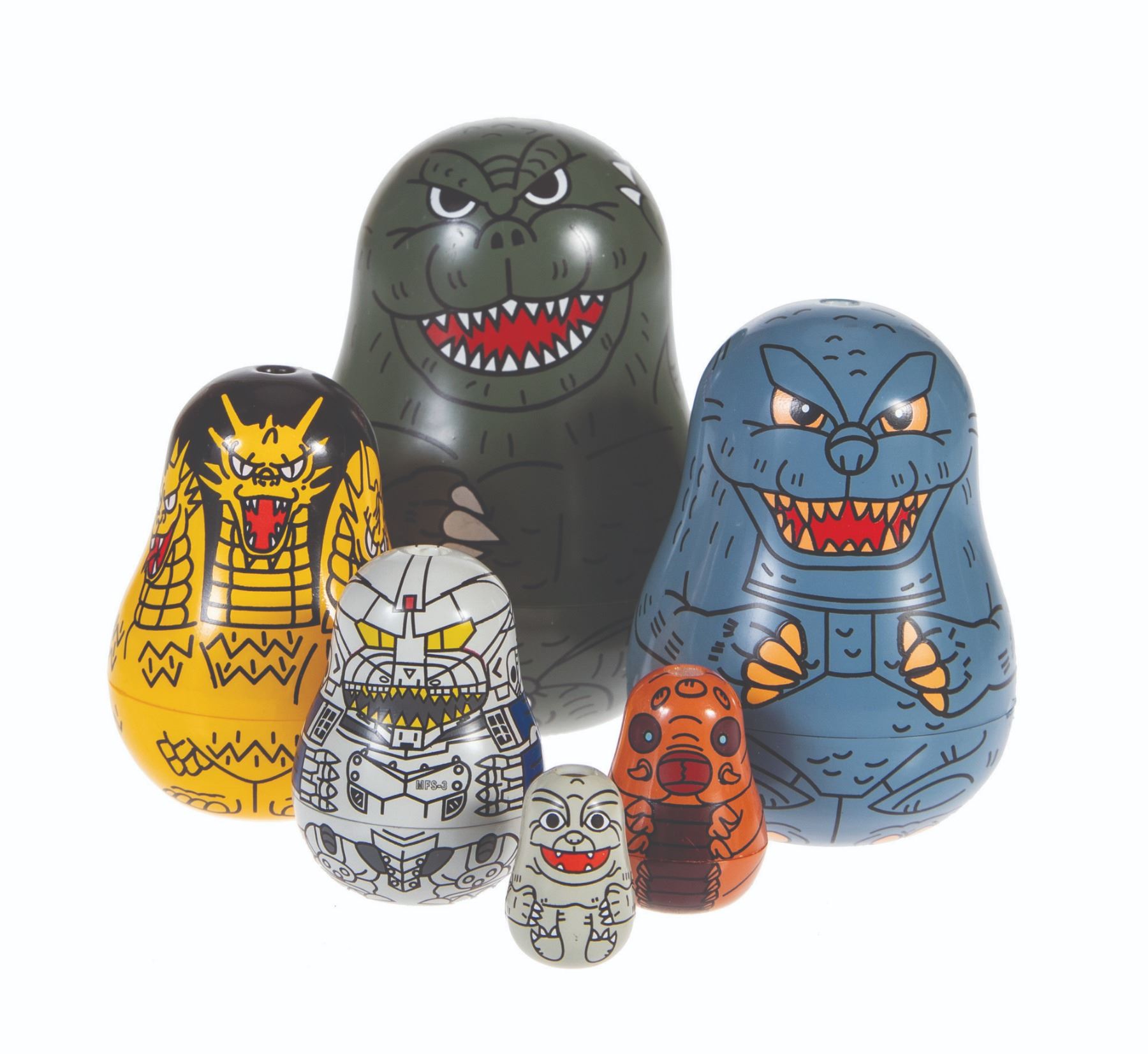 2003. Tomy Godzilla Capacara Nesting Doll Set + Boxed Doll. 3” - . 75” tall dolls. EX.