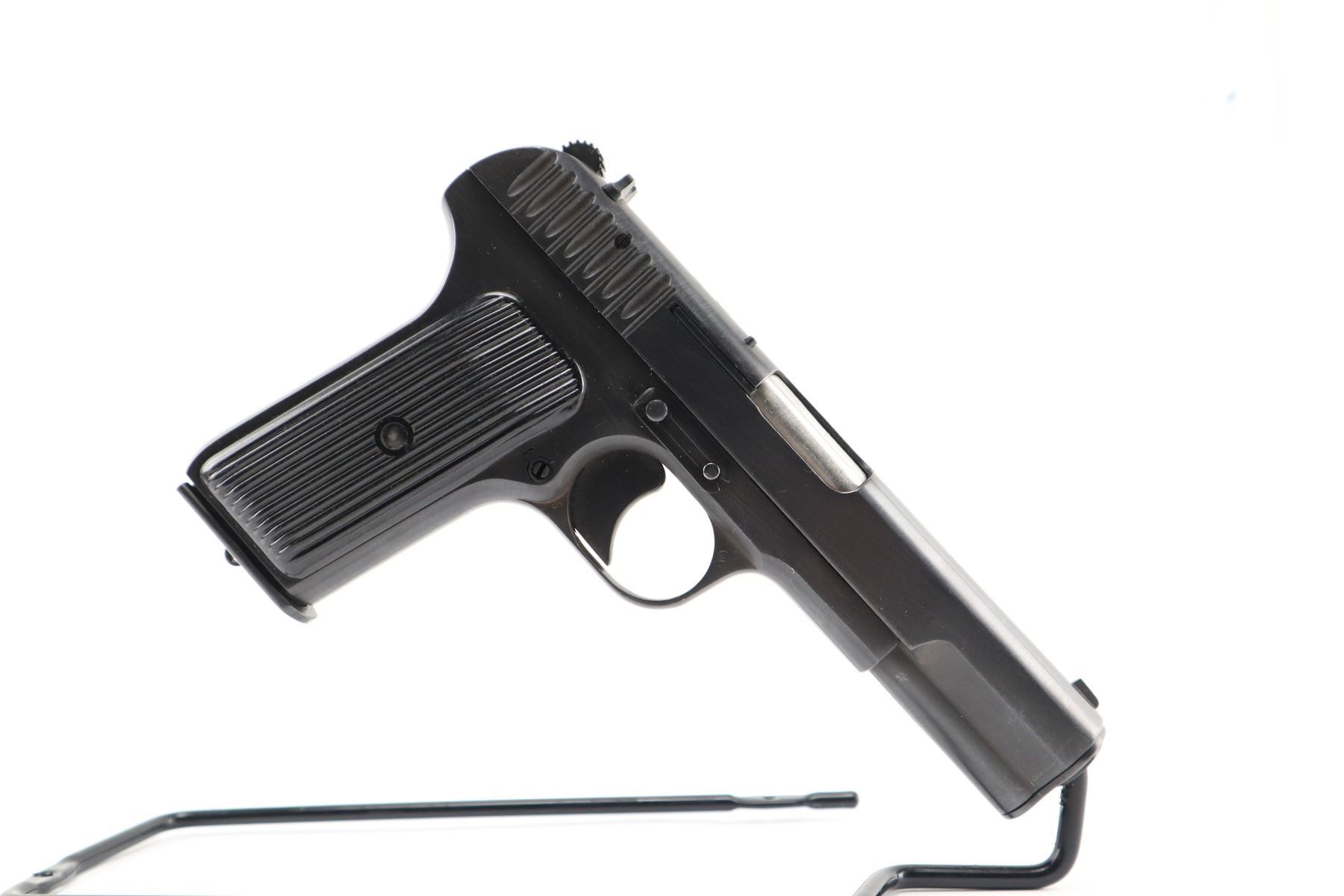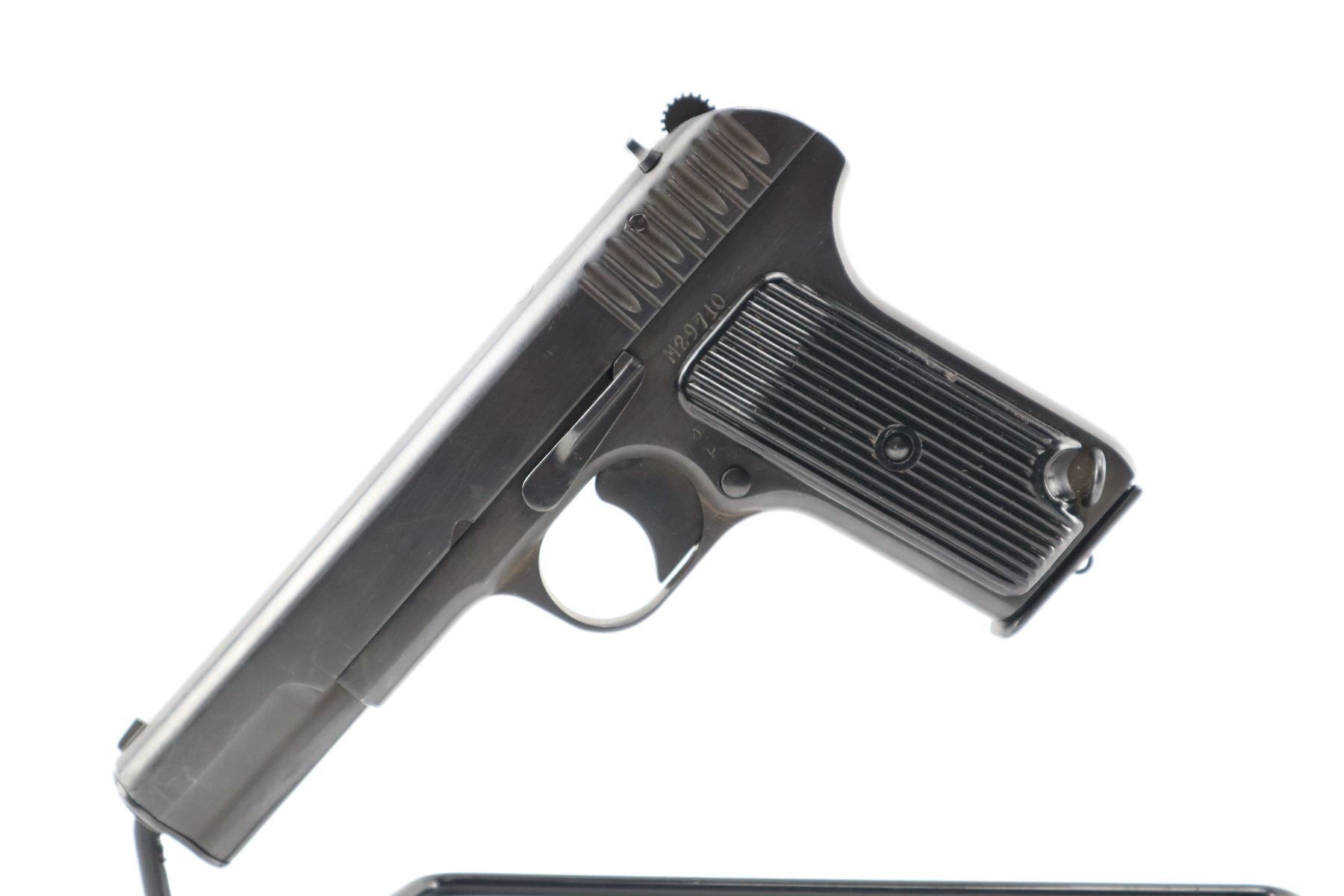 9/10 , TOKAREV , MODEL: TT33 , CALIBER: 7.62MM X 25 TOKAREV , COMES WITH MAGAZINE , DATED 1951. BORE IS BRIGHT WITH CRISP RIFLING. APPEARS UNFIRED, MAY HAVE BEEN TEST FIRED AT THE FACTORY. BLUED FINISH. NOTCH AND BLADE SIGHTS. BLACK PLASTIC STRIATED GROOVED GRIPS. LANYARD RING. SHOWS VIRTUALLY NO HANDLING MARKS. , ACTION: SEMI AUTOMATIC , BARREL LENGTH: 115MM , SERIAL # M29710 , CONDITION: 9/10 , CLASS: CANADIAN RESTRICTED