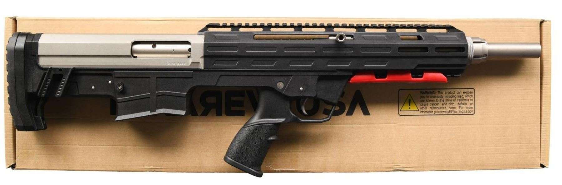 SHOTGUN WITH MATCHING BOX. Cal. 12 GA, 3". S# 52-H22YB-015010. Bbl. 18 1/2". TBP 12M semi-automatic bullpup shotgun mfg. in Turkey and imported/retailed by Tokarev USA. Left side of receiver is marked with Tokarev USA's importer information, with the model and cal. designation marked on the right. Metal components exhibit a marine nickel finish. Black polymer pistol grip buttstock and upper assembly. Cylinder choke. MAGS: 1 5-rd. UNATTACHED ACCESSORIES: matching Tokarev USA box. CONDITION: virtually new, with the shotgun remaining in its original factory plastic wrap and zip tie. Box exhibits mild exterior wear from handling and storage, but otherwise remains sturdy and serviceable. PROVENANCE: the Collection of Gun Sport Ltd owned by Jon R. Thomas. (23-3377/MLW). MODERN. $300-500.