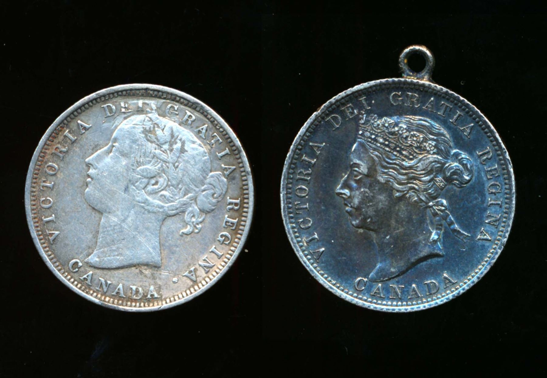 1 x 1858 Province of Canada 20 Cents w/ a 5 pointed star 4.0 gm. VF & 1870-1886 Obv.2 Victoria Quarter w/OAJC cypher in a rope edge, has a loop. AR-23 5.3 gm. VF