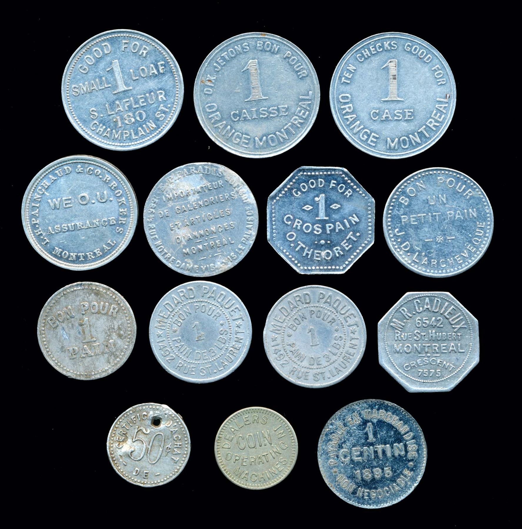 Comeau #2180a VG, Lafleur #2749a VF, L'Archeveque #2754a VF, 2 x Menard Paquet #2661a both VF, Theriault #2967f F, Theoret #2772a EF, Painchaud #3018b VF, Towle #3073a VF, Letendre #3102d VG and holed, Paradis #3200a VF, 2 x Orange Montreal #3332a both VF and an unlisted octogonal AL-27 1.15 gms. M.R.Cadieux, 6542, Rue St.Hubert, MONTREAL crescent, 7575 in 6 lines surrounded by dots. Rev: bon pour, 1 ,PETIT PAIN in 3 lines surrounded by dots.VF+.