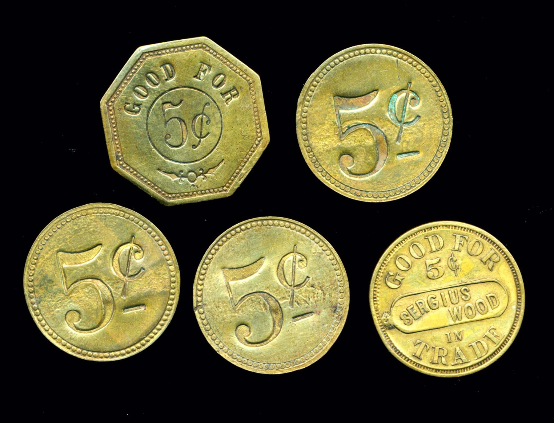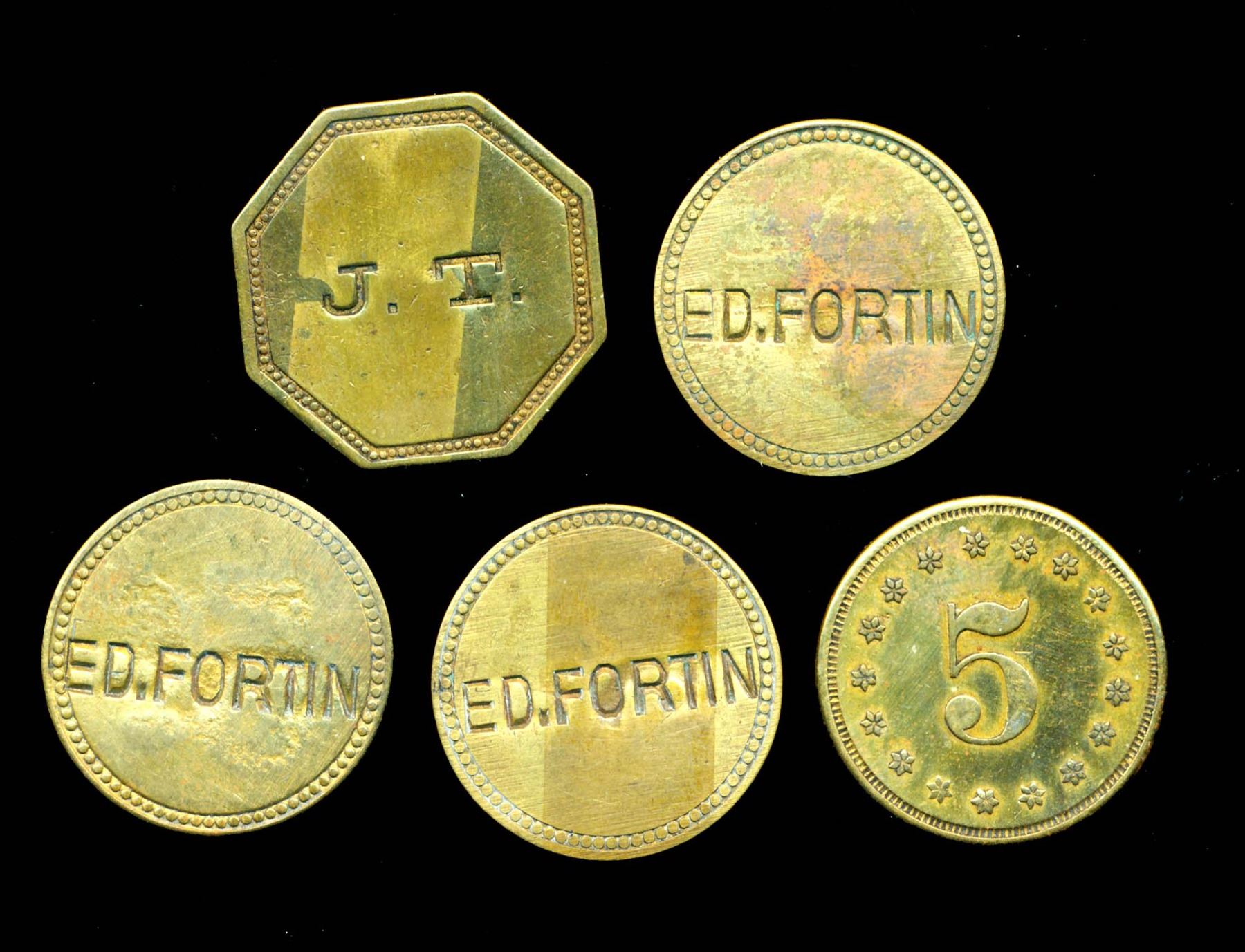3 x Ed.Fortin #5425a VF, 1 x Brass Octogonal 5.14 gm. Obv: Good for 5 Cents w/winged "O" Rev:J.T. unlisted VF, 1 x Sergius Wood Brass Round 25 mm. 4.51 gms. Obv:Good for 5 cents in Trade Rev: 17 6-petal rosettes around the number "5" surrounded by incused denticles.Unlisted VF.