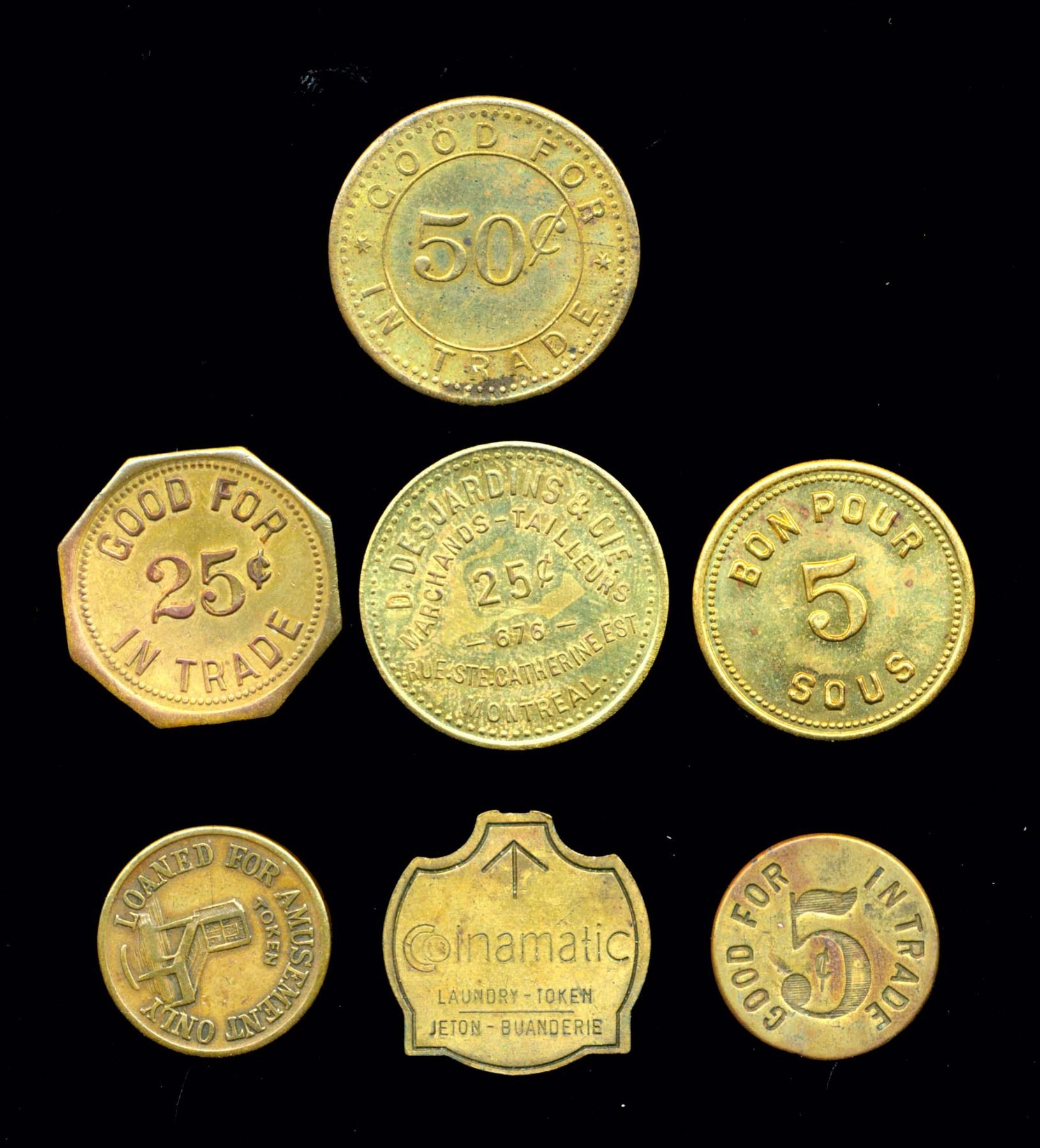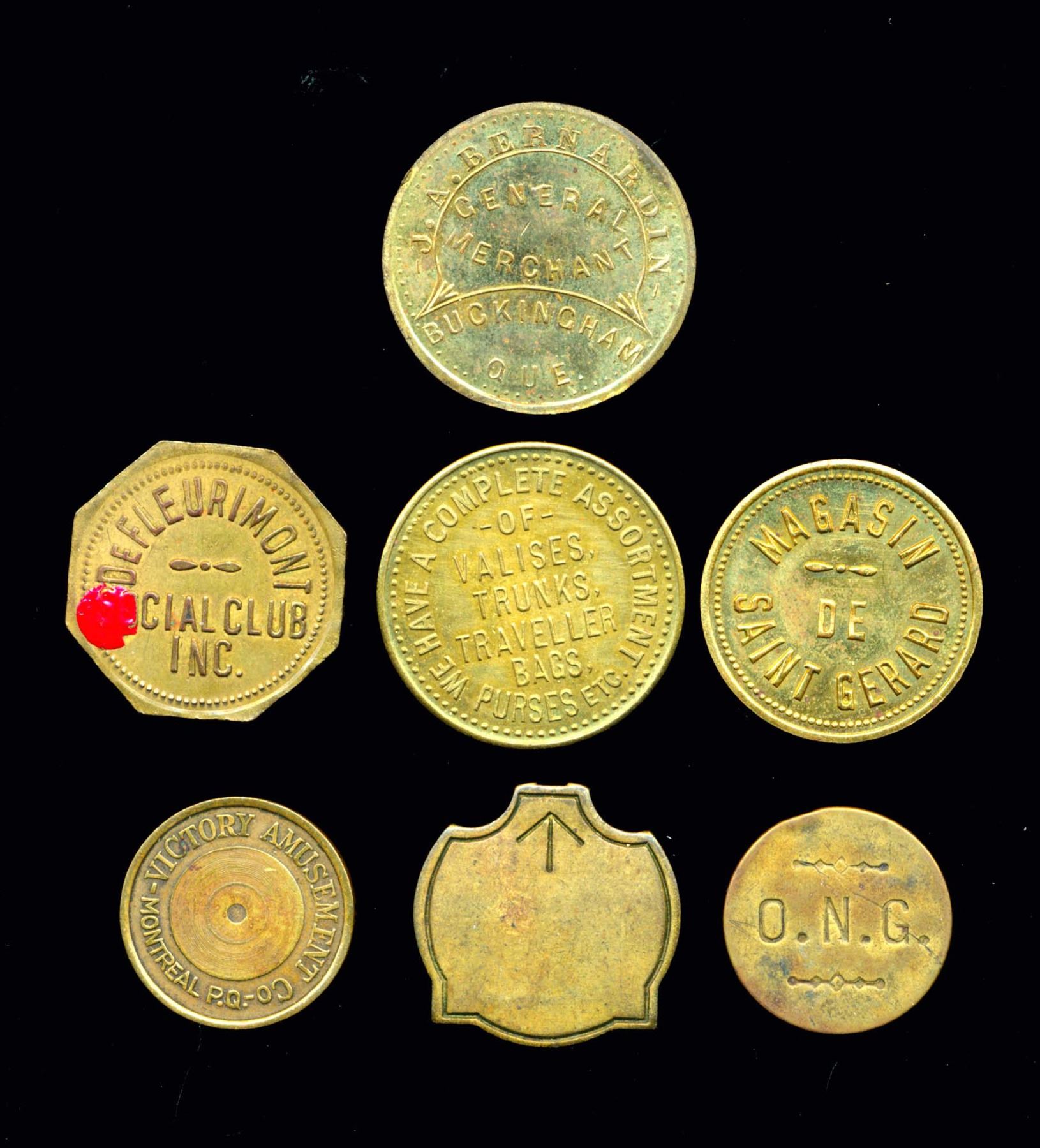 J.A.Bernardin #1208b VF+, DeFleuimont #2820c EF, Desjardins #2904c EF+, Coinamatic #3040a VF,O.N.G. #3109e VF, Victory Amusements #3245a VF, Magasin St-Gerard #4660e EF.
