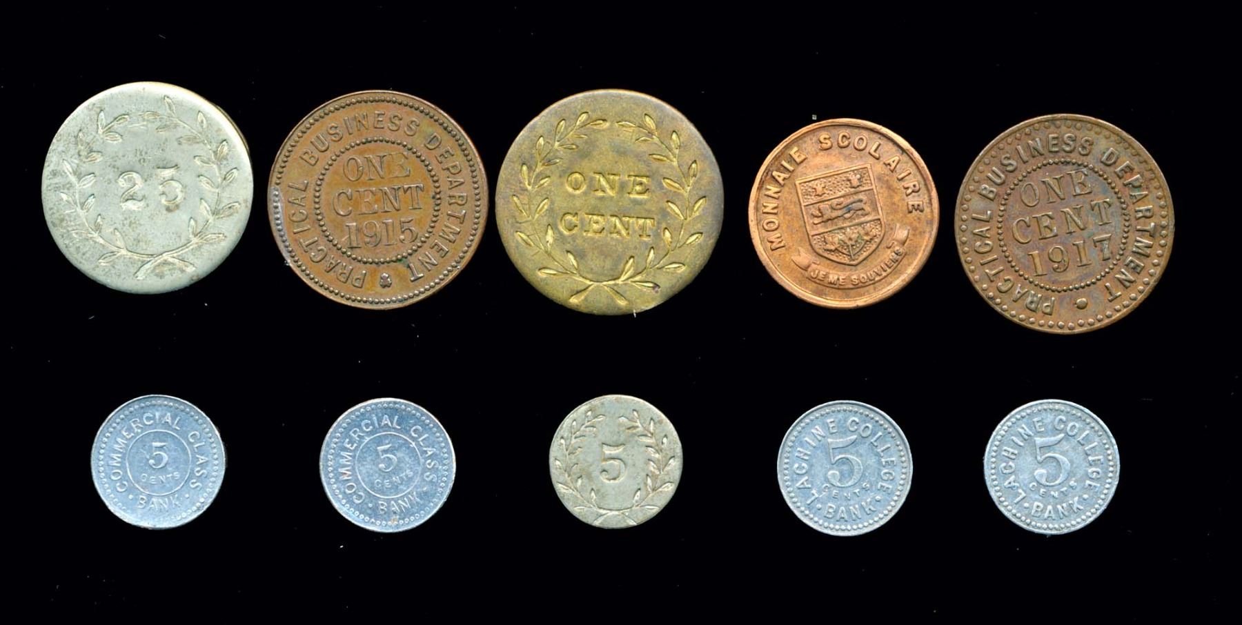 Consists of a partial set of 3 College de Hull (25 Cents Al-25 # 1880c, 5 Cents Al-15 #1880e and 1 Cent br-26 #1880f), 2 x Lachine College Al-16 5 Cents #2104e VF, 2 x Commercial Class Bank Al-16 #3847e VF, 1915 AE-26 One Cent Commercial Academy #3845f, 1917 AE-26 One Cent Academie St-Sauveur #3844f EF and 1 x AE-27 Obv: Monnaie Scolaire w/Coat of Armes and Motto of the Province of Quebec.and Rev: the number "25" in a wreath of Maple leaves VF.