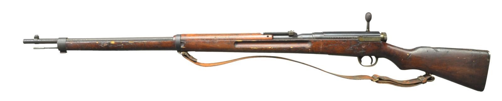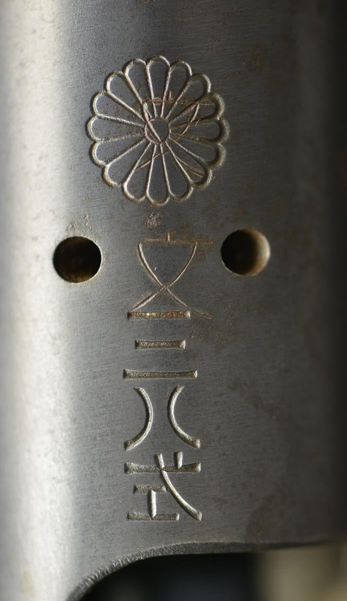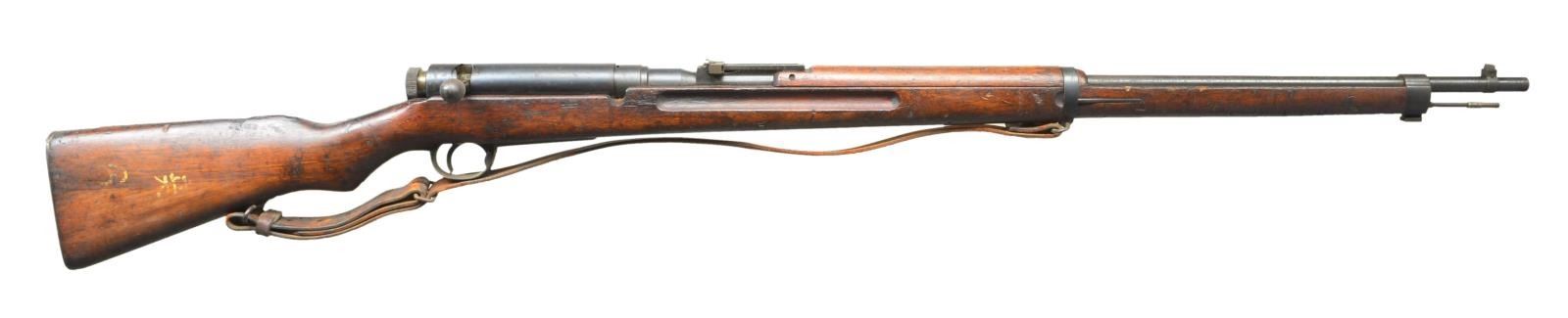 RIFLE. Cal. 6.5 Jap. S# 002024211. Bbl. 31". Mixed assembly numbers. Mum has over stamped Kanji character. 00 prefix indicates school use. Ladder rear sight graduated to 2400m. Inverted V front sight. Asian hardwood stock set w/ two piece butt construction. Bottom mounted sling swivels w/ worn original sling. White painted Kanji markings on right side of butt. Cleaning rod present. CONDITION: stock set shows some chipping, gouges, scattered dings & handling marks. Metal shows traces of arsenal blue w/ scattered oxidation most notably on the bbl & areas turning to a brown patina. Fair bore w/ scattered frosting. (22-3510/MJC). CURIO. $400-600.
