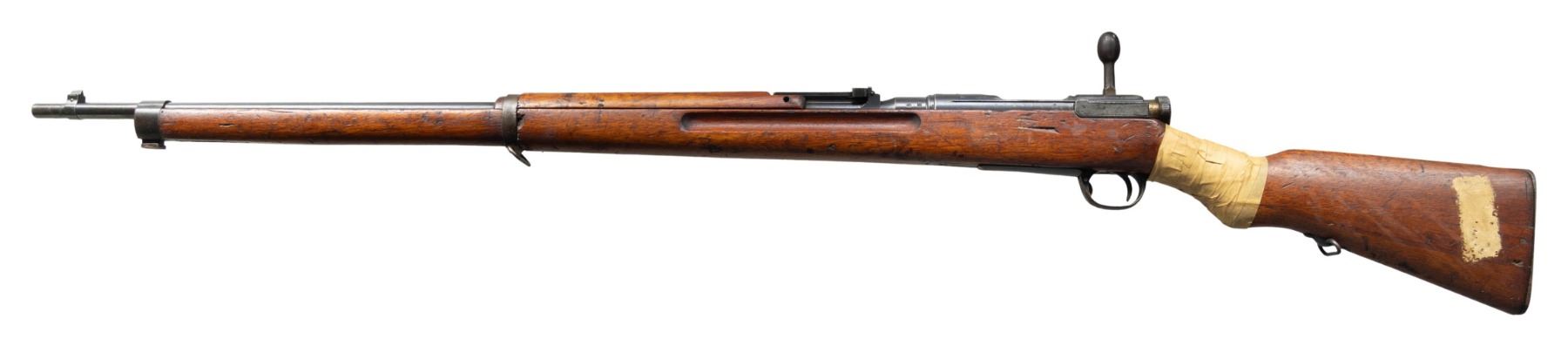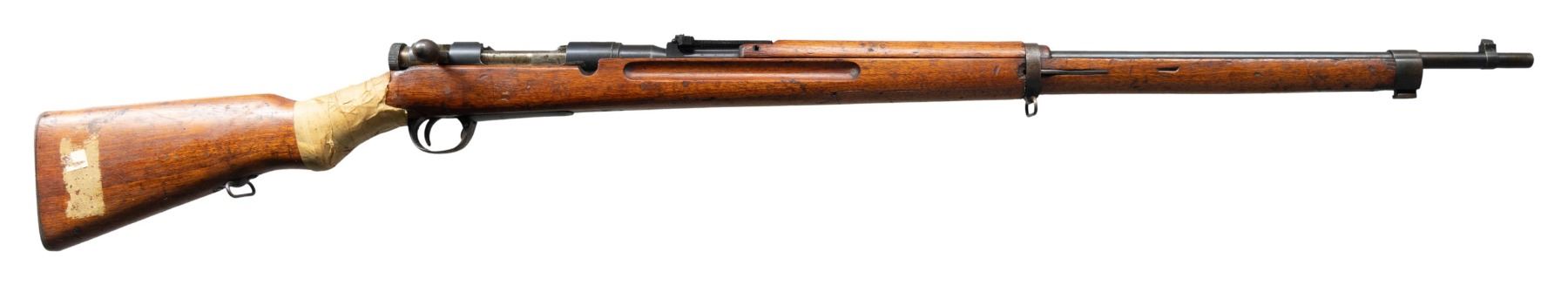 Cal. 6.5 Jap. S# 89232. Bbl. 31 1/2". Standard T38 sights. Assembly numbers appear mismatched. Receiver ring has ground mum & T38 markings. Left side of receiver has Tokyo Arsenal symbol with serial number. Blued finish. Asian hardwood stock set with two piece butt & bottom mounted sling swivels. No cleaning rod present. CONDITION: stock set has old wrapping around wrist that appears to be a repair for large cracks & chips, sticker & paint residue on both sides of butt, some chipping behind rear band, further scattered finish loss, chips, dings & handling marks. Metal retains 40% arsenal blue with overall fading to gray, edge wear & oxidation. Action functions properly when hand cycled. Dark bore with oxidation & pitting but strong rifling. (25-3086/MJC). CURIO. $300-400.