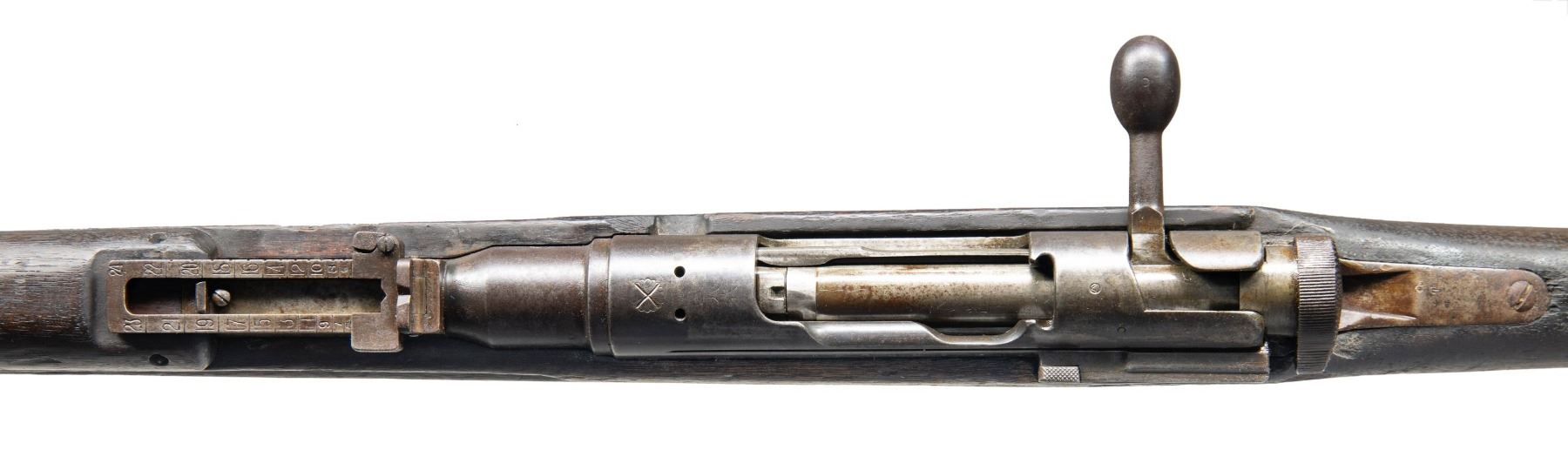 Cal. 6.5 Jap. S# 160491. Bbl. 31 1/2". Standard T38 sights. Mismatched assembly numbers throughout. Receiver top has "X'd" out mum with Type 38 markings. Left side of receiver has Tokyo arsenal marking with serial number. No follower, floorplate or cleaning rod present. Blued finish. Asian hardwood stock with two piece butt & bottom mounted sling swivels. Right side of butt has inverted "124" stamping. CONDITION: stock set has a dark appearance with overall heavy wear, some light cracks behind upper tang scattered gouges, dings, scratches, chips & handling marks. Metal is mostly a gray color with oxidation, dings, pitting & traces of bluing. Action functions properly when hand cycled. Bore shows scattered oxidation & pitting but good rifling. (25-3090/MJC). CURIO. $100-300.