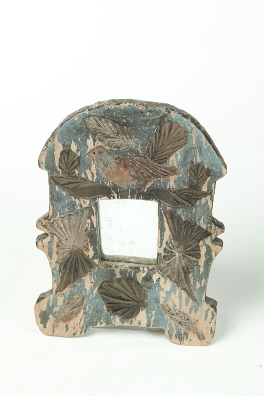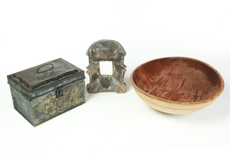 American, 2nd half-19th century. Tole document box with original stenciled floral designs, 6"h. 9"w. and a treenware bowl with old yellow paint on the exterior, 5"h. 15"d. Together with a folk art mirror with carved birds and leaves. Worn original paint, 9 1/2"h. Imperfections.