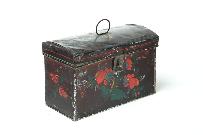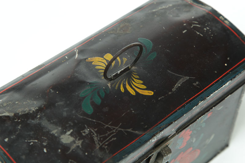 American, 2nd quarter-19th century. Original japanned ground with floral sprays in red and blue. Wear. 6 1/4"h. 10"w.