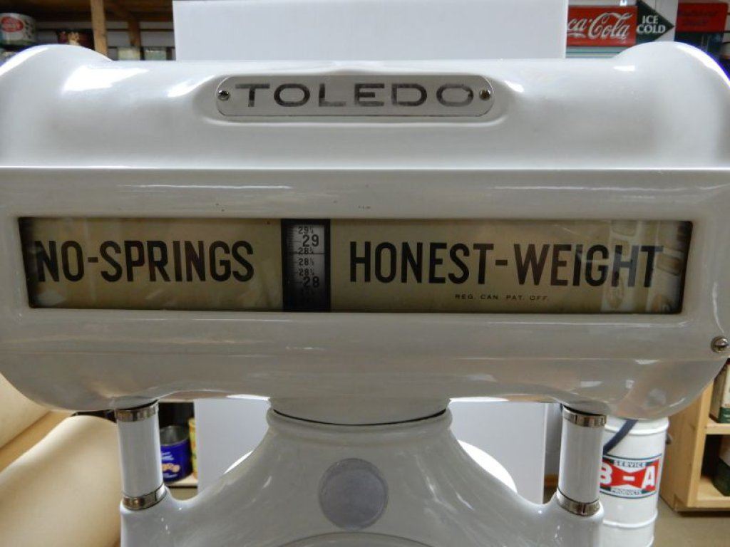 TOLEDO PORC. BUTCHER SCALE "NO SPRINGS HONEST WEIGHT" - GOOD CONDITION- 22" X 16" X 29" LOCATION: LOWER BACKROOM