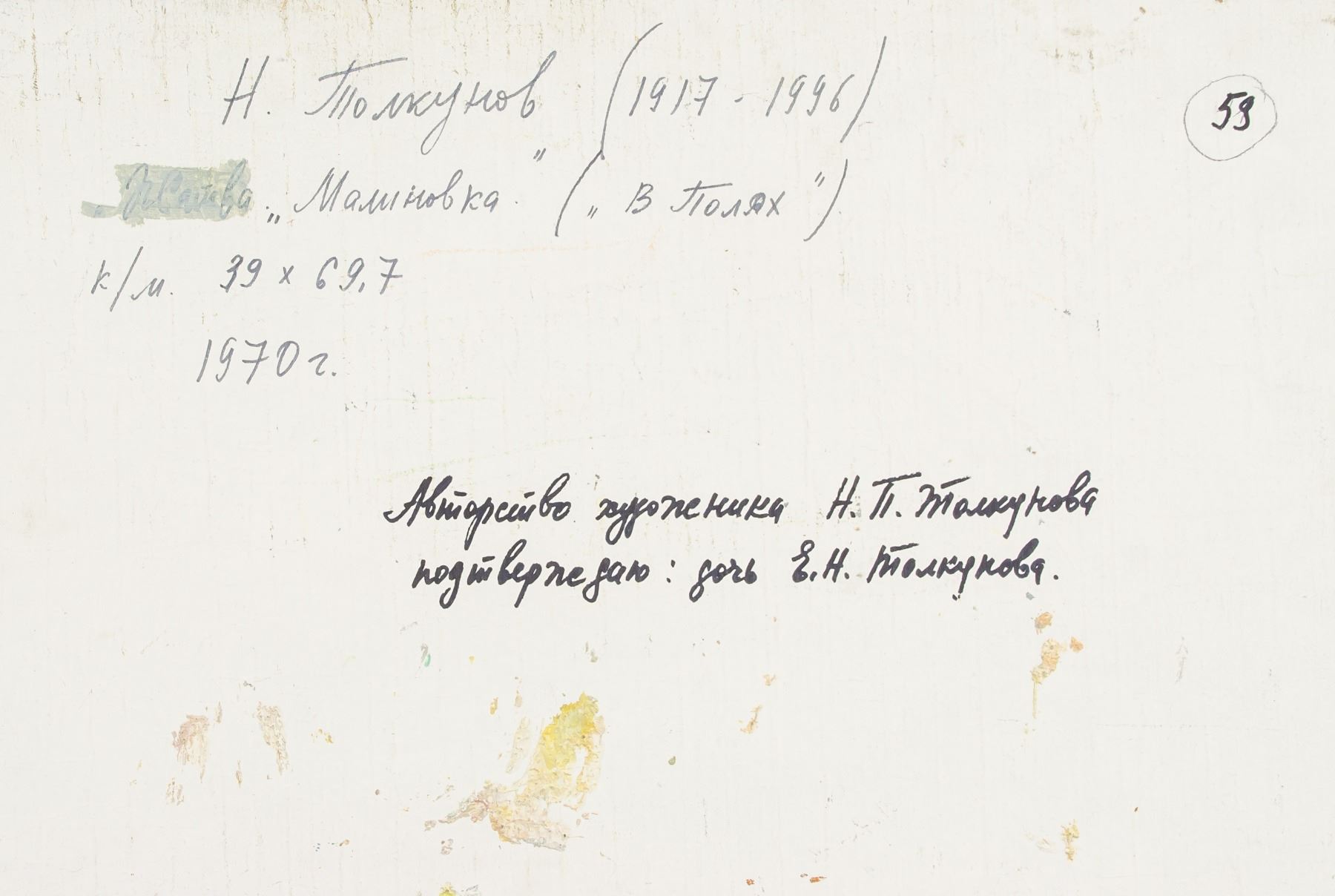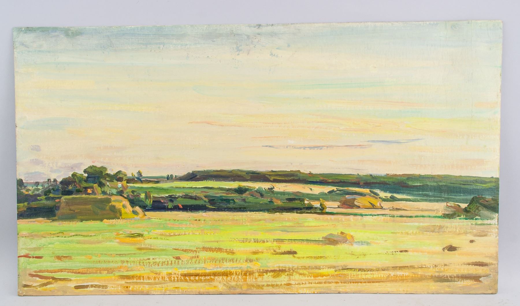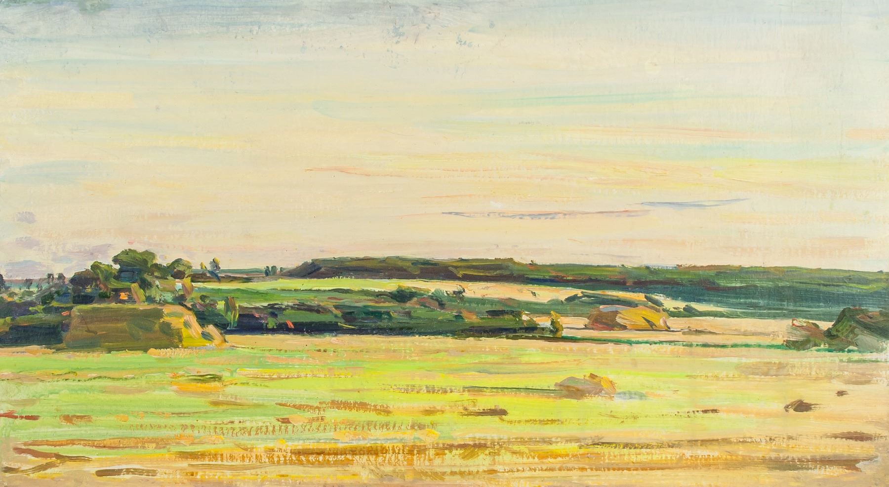 Oil on cardboard painting, entitled "Malinovka" (At the fields) and dated 1970 with dimensions in Cyrillic, verso. Unsigned by Tolkunov Nikolay Pavlovich (Russian, 1917-1996). 39 x 69.7 cm (15.4 x 27.4 in). Accompanied by a certificate of authenticity from Tolkunov Andrei Petrovich, grandson of the artist, Tolkunov Nikolay Pavlovich. Tolkunov Nikolay Pavlovich was an honored artist of the RSFSR. In 1942 graduated from Moscow Art Institute, studied under S.V. Gerasimov. Participated in all-union, republican and regional art exhibitions since 1938. Gave lectures at V.I. Surikov Moscow State Art Institute since 1960. The works of the artist are exhibited in the Russian State Museum, in many regional museums, and in collections abroad. PROVENANCE: Private Russian collection. Acquired by the present owner from the artist's family