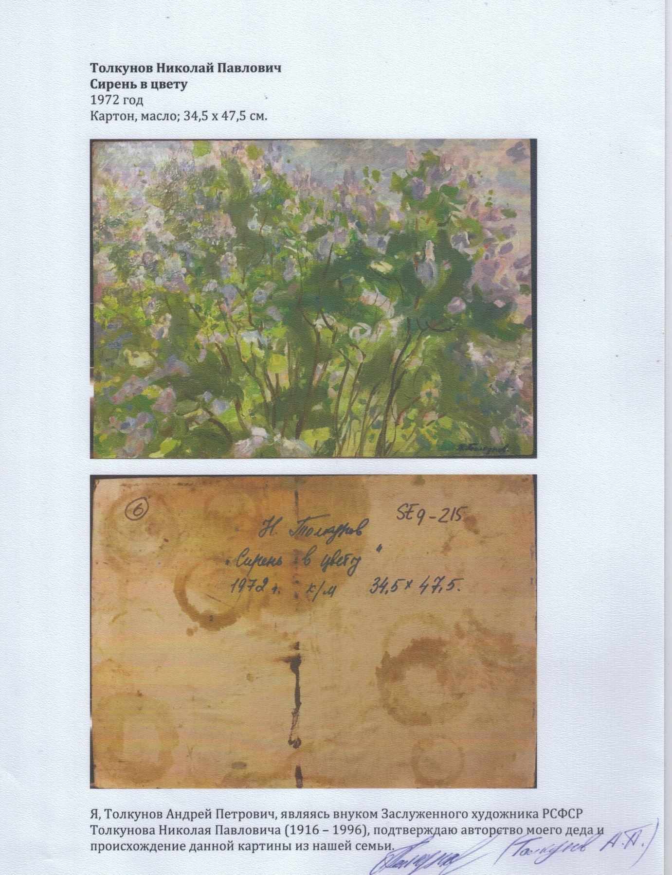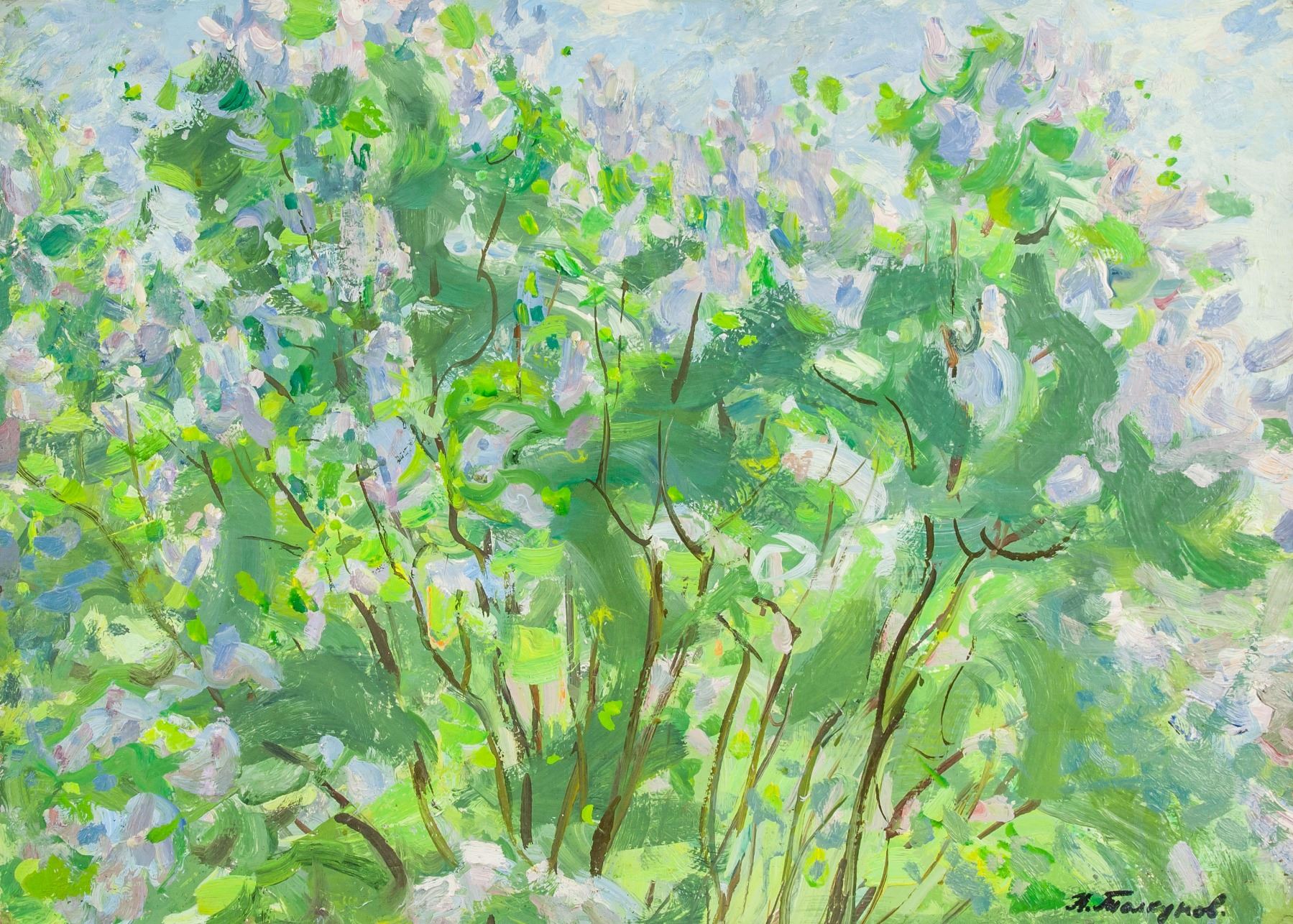 Oil on cardboard, entitled, "Lilac in blossom" and dated 1972 with dimensions in Cyrillic, verso. Signed on the lower right corner by Tolkunov Nikolay Pavlovich (Russian, 1917-1996). 34.5 x 47.5 cm (13.6 x 18.7 in). Accompanied by a certificate of authenticity from Tolkunov Andrei Petrovich, grandson of the artist, Tolkunov Nikolay Pavlovich. Tolkunov Nikolay Pavlovich was an honored artist of the RSFSR. In 1942 graduated from Moscow Art Institute, studied under S.V. Gerasimov. Participated in all-union, republican and regional art exhibitions since 1938. Gave lectures at V.I. Surikov Moscow State Art Institute since 1960. The works of the artist are exhibited in the Russian State Museum, in many regional museums, and in collections abroad. PROVENANCE: Private Russian collection. Acquired by the present owner from the artist's family