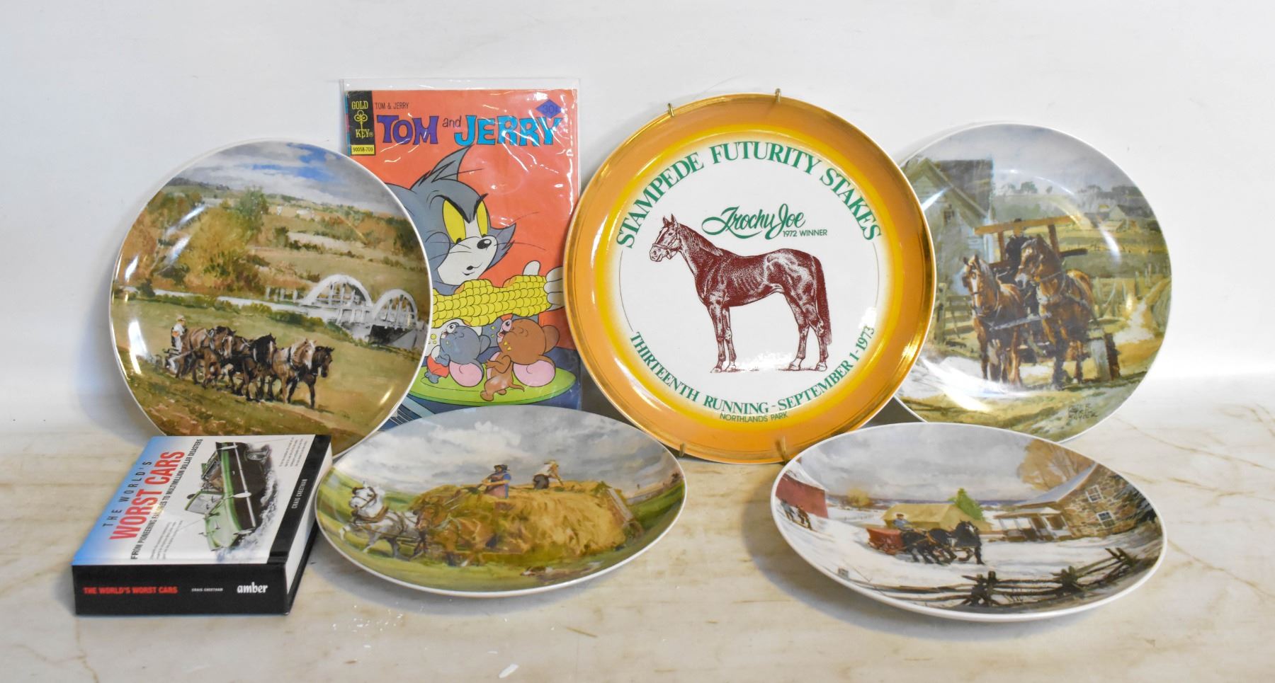 BOOK OF WORLDS WORST CARS, HORSE THEMED COLLECTOR PLATES - SET OF 4 BAVARIA SCHUMANN ARZBERG GERMANY PLATES AND 1 NORTHLANDS PARK 22K GOLD RIMMED PLATE