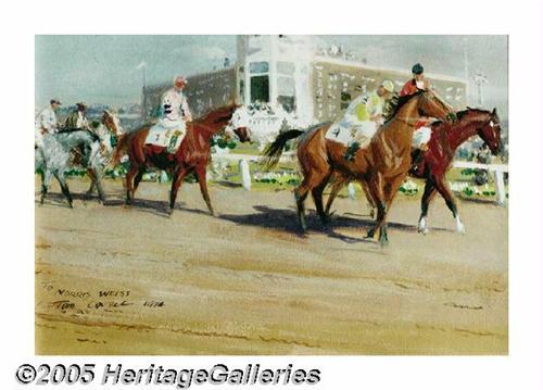 <B>TOM LOVELL (American 1901-1997)</B></I> <BR>Leading Out<BR>Original Illustration, 1974 <BR>Gouache on board <BR>6in. x 8.5in. (sight size) <BR>Signed and dated lower left <BR>Inscribed to 'To Morris Weiss' lower left. <BR>Provenance: Morris Weiss collection <BR><BR>Condition Report: Overall excellent condition<BR>