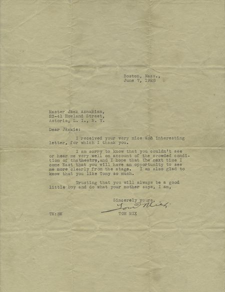 (1880 - 1940) American actor who appeared in "Wild West" shows and starred in over 100 silent films. T.L.S. 1p. 4to., Boston, June 7, 1928 to a young fan in New York who saw Mix and his horse, Tony, at an appearance in New York. Mix is sorry Jack couldn't see or hear him very well in the crowded theatre and he hopes next time he comes East, Jack will be able to see him more clearly. He is happy that Jack likes Tony so much. He also tells Jack: "...be a good little boy and do what your mother says….". Slightly toned otherwise very good.