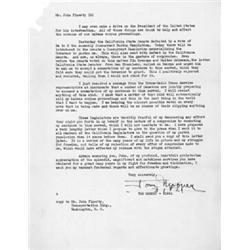 TOM MOONEY: (1882 - 1942) American labor leader and active Socialist, with Warren Billings he was convicted of planting a bomb that killed nine and wounded 40 during the "Preparedness Parade" in San Francisco and pardoned in 1939. Outstanding content T.L.S. "Tom Mooney 31921" on his illustrated letterhead showing him before and after his "frame-up", 3pp. 4to., "County Jail No. 1", San Francisco, Mar. 17, 1937 to attorney John Finerty. In small part: "...I think that the Justices of the California Supreme Court have their minds made up and will unquestionably vote against granting our writ of habeas corpus...nothing either of you say...will affect their final decision...Our one and only aim at this time is to get the matter out of the California Supreme Court...you appearance here would positively arouse the most bitter antagonism. You are generally hated by both Cleary and Mitchell...hoping the court will permit me to remain here in the county jail while the matter is being prepared for the United States Supreme Court...if I could secure an unconditional pardon from this body I would accept it...I may even make a drive on the President of the United States...a number of Senators are jointly preparing to sponsor a commutation...[they are] terribly fearful of my denouncing any effort...[to] commute my sentence to time served...". Much more fine content! Upper-left corner chipped where pulled from a binder, otherwise very good. $400-500