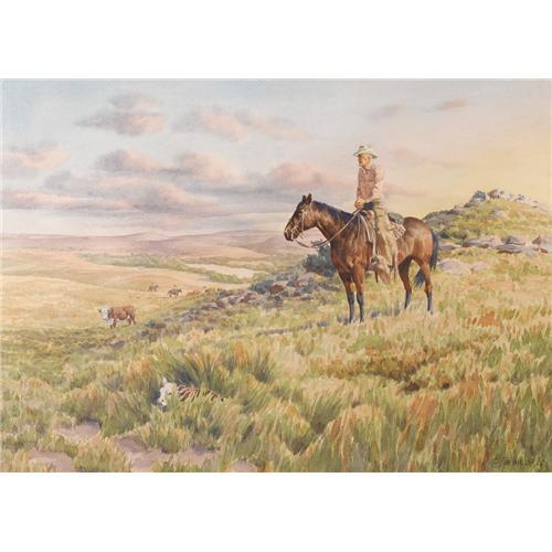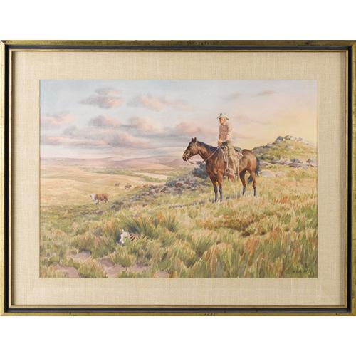 <B>TOM PHILLIPS</B></I> (American b. 1927)<BR><I>Cowboy Watcher</B></I><BR>Watercolor on paper<BR>20 x 28 inches (50.8 x 71.1 cm)<BR>Signed lower right: <I>©Tom Phillips</B></I><BR><BR><BR><BR><b>Shipping:</b> Requires 3rd Party Shipping (<a target="_blank" href="http://www.heritageauctions.com/common/shipping.php">view shipping information</a>)