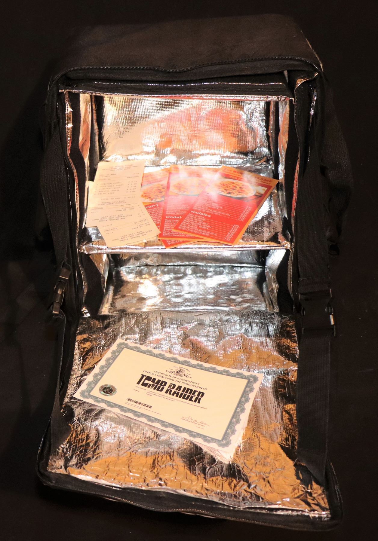 TOMB RAIDER LARA CROFT SNACK CYCLE BACK PACK WITH MENUES AND RECEIPTS