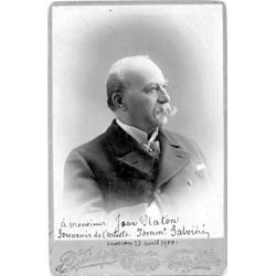 TOMMASO SALVINI: (1830 - 1915) Italian actor renowned for his roles in Oreste, Francesca da Rimini, and Othello. Fine vintage I.S.P., a handsome cabinet photo by Brodowsky, Moscow, showing Salvini in head and shoulders, inscribed at bottom of photo: "A Monsieur Jean Platon souvenir de l'artiste. Tomm. Salvini Moscow, 25 Avril 1900". Very good condition, ideal for display. $150-200