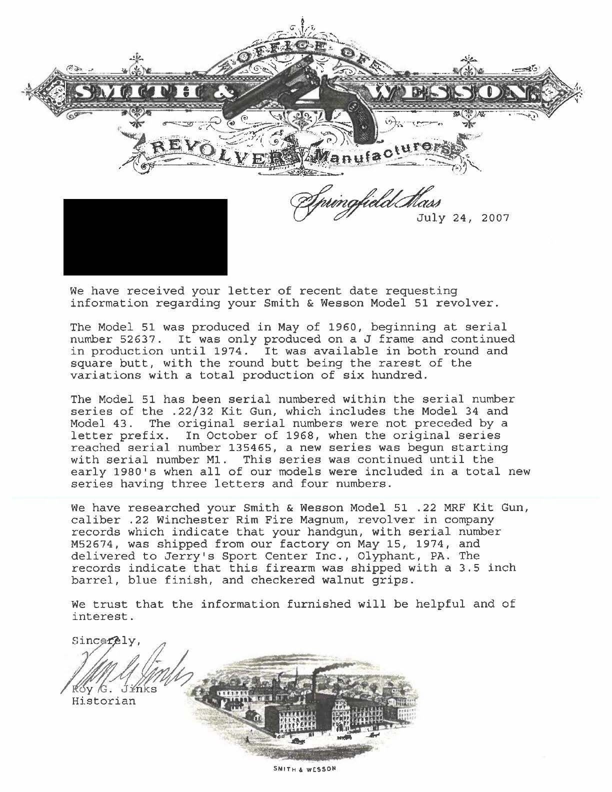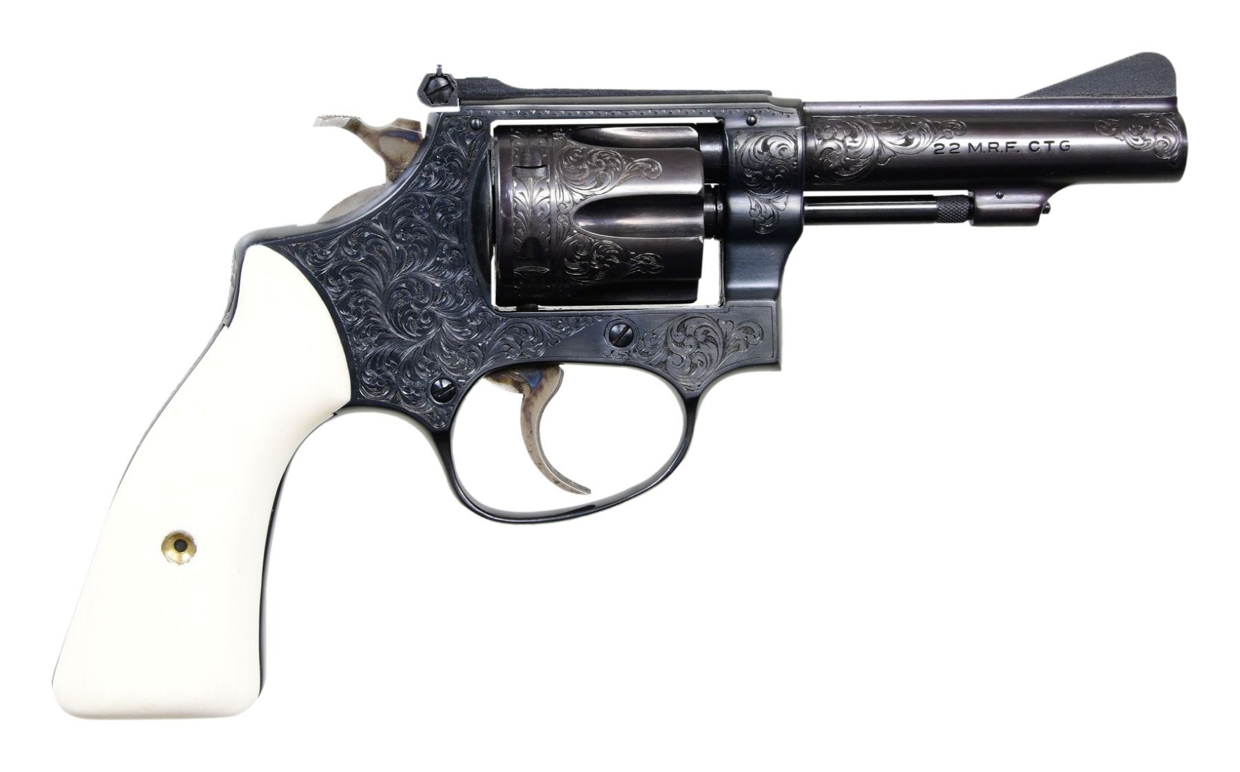 REVOLVER. Cal. 22 Mag. S# M52674. Bbl. 3 1/2". Ramped serrated blade front sight. Adjustable square notch rear sight. Smith & Wesson Model 51 engraved by Master Engraver Tommy J. Kaye with his signature on left side of frame. Kaye was a founding member of the Firearms Engravers Guild of America. Revolver features scroll engraving with a floral pattern. Engraver applied blue finish with case colored hammer & trigger. White colored grips. UNATTACHED ACCESSORIES: factory letter that confirms the bbl. length & states it was shipped to Jerry's Sport Center in Olyphant, PA in 1974. CONDITION: all aspects near excellent. PROVENANCE: From the Estate of Jon Thomas, Gunsport, LTD. (25-1094/MJC). CURIO. $800-1200.