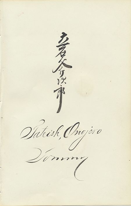 TATEISHI "TOMMY" ONOJIRO The youngest of a group of Samurai who toured the United States in 1860 on Japan's first diplomatic venture beyond its shores after more than two centuries of near-total isolation. This nine-month voyage served to ratify a treaty Japan’s Tokugawa Shogunate signed with the U.S. in 1858. Over 170 Japanese left from Tokyo, including the official delegation of 76 samurai, interpreters, doctors and other functionaries and sailed into San Francisco Bay. The Embassy completed its mission in Washington, traveled through Baltimore and Philadelphia and ended its visit with a two-week stay in New York. According to a recent article in the New York Times, Tommy was a heartthrob who had women swooning: "From Washington Heights to East Broadway, Tommy is already a household word, Vanity Fair gushed. Lapping up the adulation, the young man mugged for the crowds and blew kisses to them, in stark contrast to the iron faces who formed the rest of the Japanese delegation...And so he had a tune dedicated to him...". Indeed "Tommy Polka" was apparently a hit tune in its time. An interesting lot, being the signature of Onojiro on an 8vo. sheet in Japanese, along with those of 11 other samurai on other sheets, penned in Japanese with three identified in English: Senne Bujennekame, Senme Bujennokama [?], Murazake, and Oguri. Fine condition, worthy of further research.