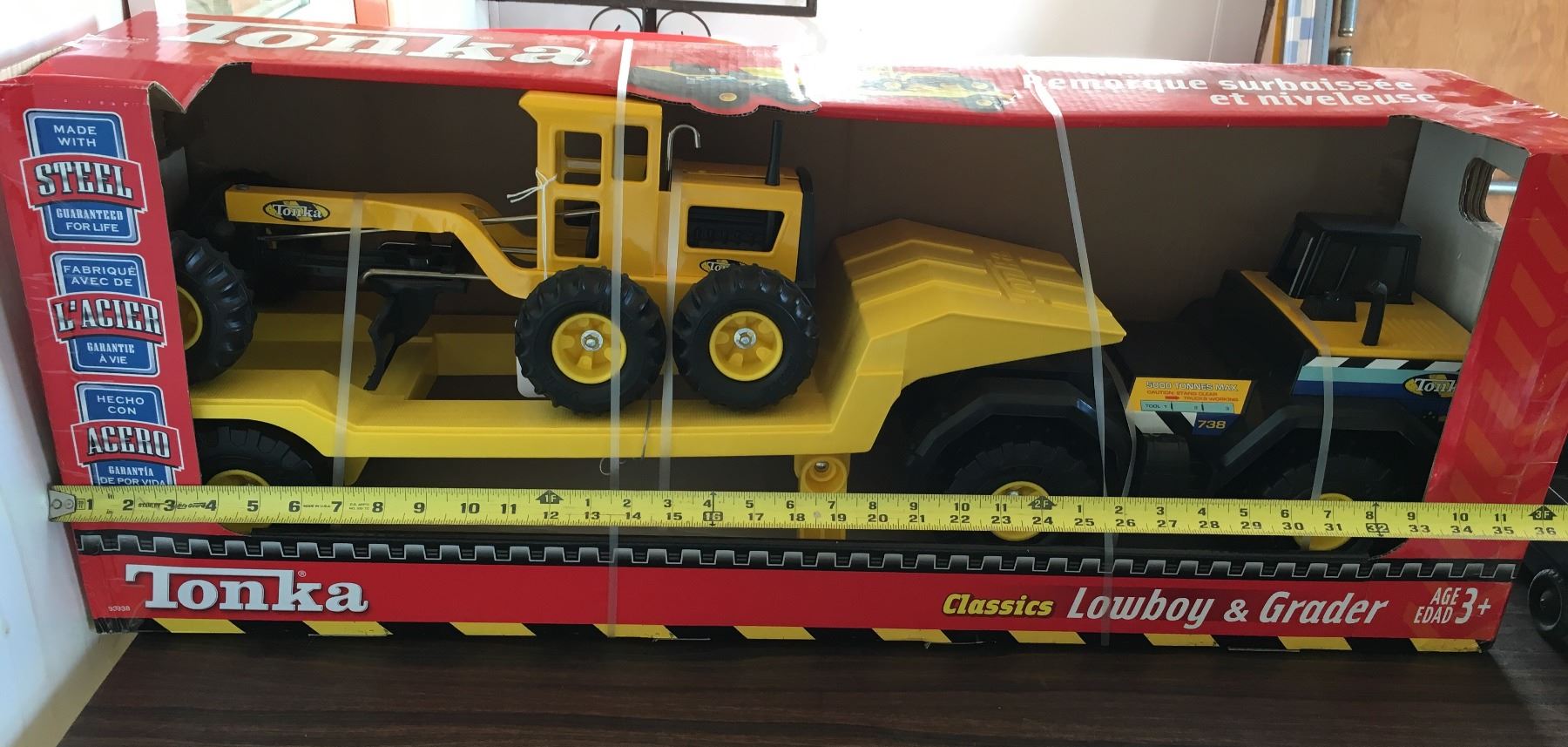 2 TRUCK SET, HAULER & GRADER, METAL, NEW IN BOX, APPROX 3'. CONDITION: E