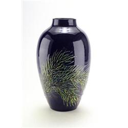 Keramik. Rotbrauner Scherben, dunkelblaue Überlaufglasur mit grüner Gießbüchsenmalerei eines Dekors von Kiefernzweigen auf der Wandung. Über rundem Stand ovoide Form mit kurzem, engem Hals. H.: 31 cm. Bez.: Firmenmarke mit GESETZL.GESCHZT, Zusatz MUSTER GESETZL.GESCHTZT (Pressstempel), 78 x 4 (geritzt). Um 1897