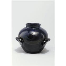 Keramik. Rotbrauner Scherben mit blauer Überlaufglasur auf anthrazitfarbenem Grund. Umlaufendes wellenförmiges braunes Fadendekor. H.: 17,5 cm. Bez.: Firmenmarke, MUSTER GESETZL GESCHTZT GESETZL GESCHÜTZT (Blindstempel), Mod.Nr. 316 S. Um 1905.