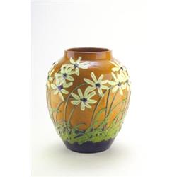 Keramik. Rotbrauner Scherben, unter transparenter Glasur Gießbüchsenmalerei in Weiß, Grün und Schwarz auf rotbraunem Grund, umlaufendes, reliefiertes Sternblumendekor. Hohe bauchige Form mit kleiner ausgezogener Mündung. Am Mündungsrand äu. min. best. H.: 19,5 cm. Bez.: Firmenmarke mit Zusatz GESETZLICH GESCHÜTZT und MUSTER GESETZLICH GESCHÜTZT (Pressmarke), Mod.Nr. 89X und H (geritzt). 1898