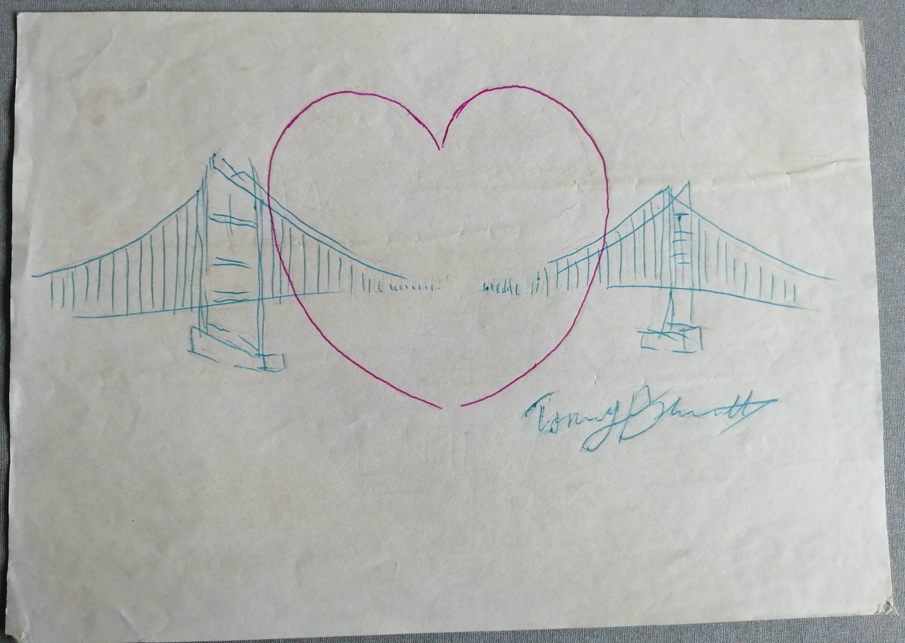Tony Bennett is best known for his musical career, but the octogenarian singer (like a growing number of public figures) is also an accomplished painter, and drawer. His drawing of the Golden Gate Bridge, has a big heart in the middle and is signed by Tony Bennett. Size of paper 11.5x8.25 inches. Mounted and framed, supplied with coa.