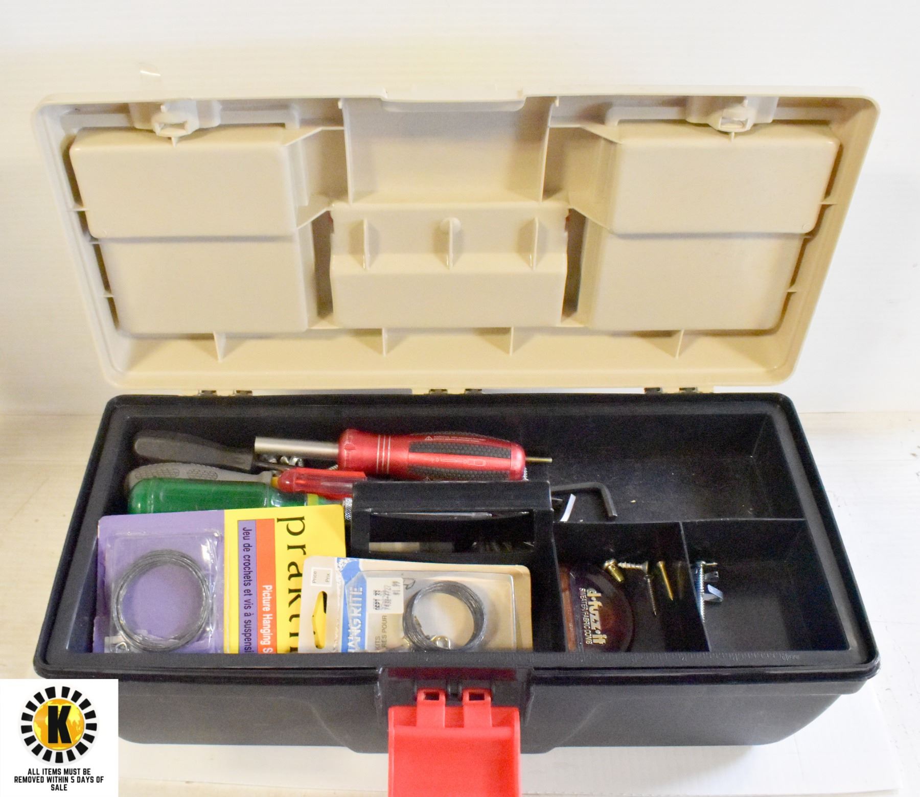TOOL BOX FULL OF ASSORTED TOOLS & HARDWARE