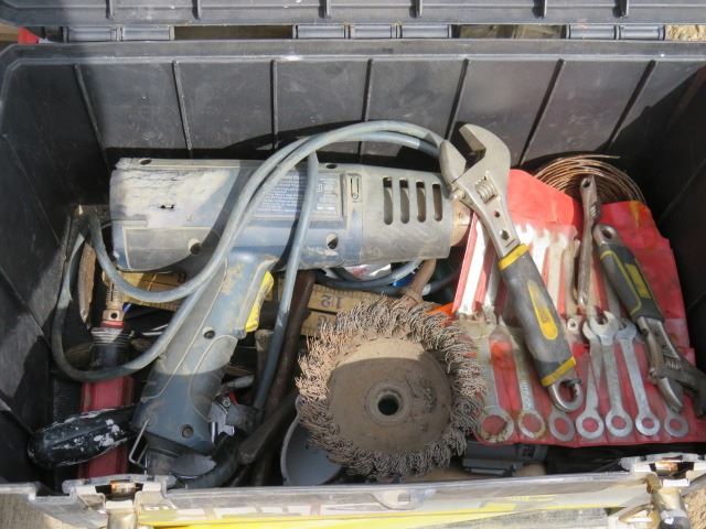 TOOL BOX (STANLEY) *INCLUDES ASSORTED TOOLS; HEAT GUN, WRENCHES, WIRE CHIMNEY BRUSH, ETC*