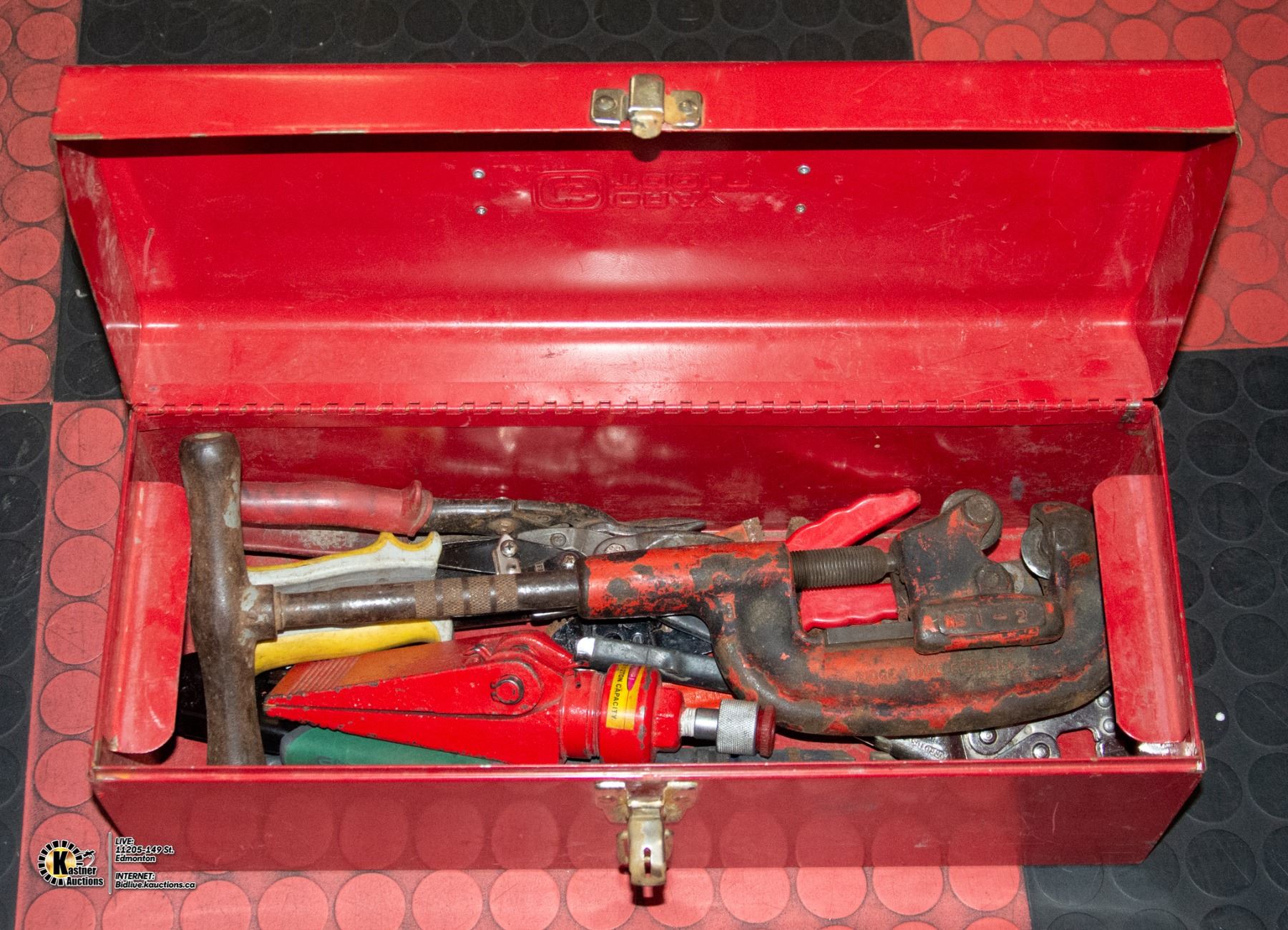 TOOL BOX W/ PIPE WRENCHES, PIPE CUTTER