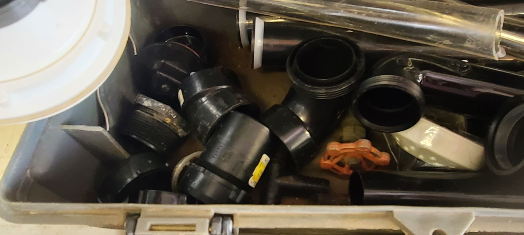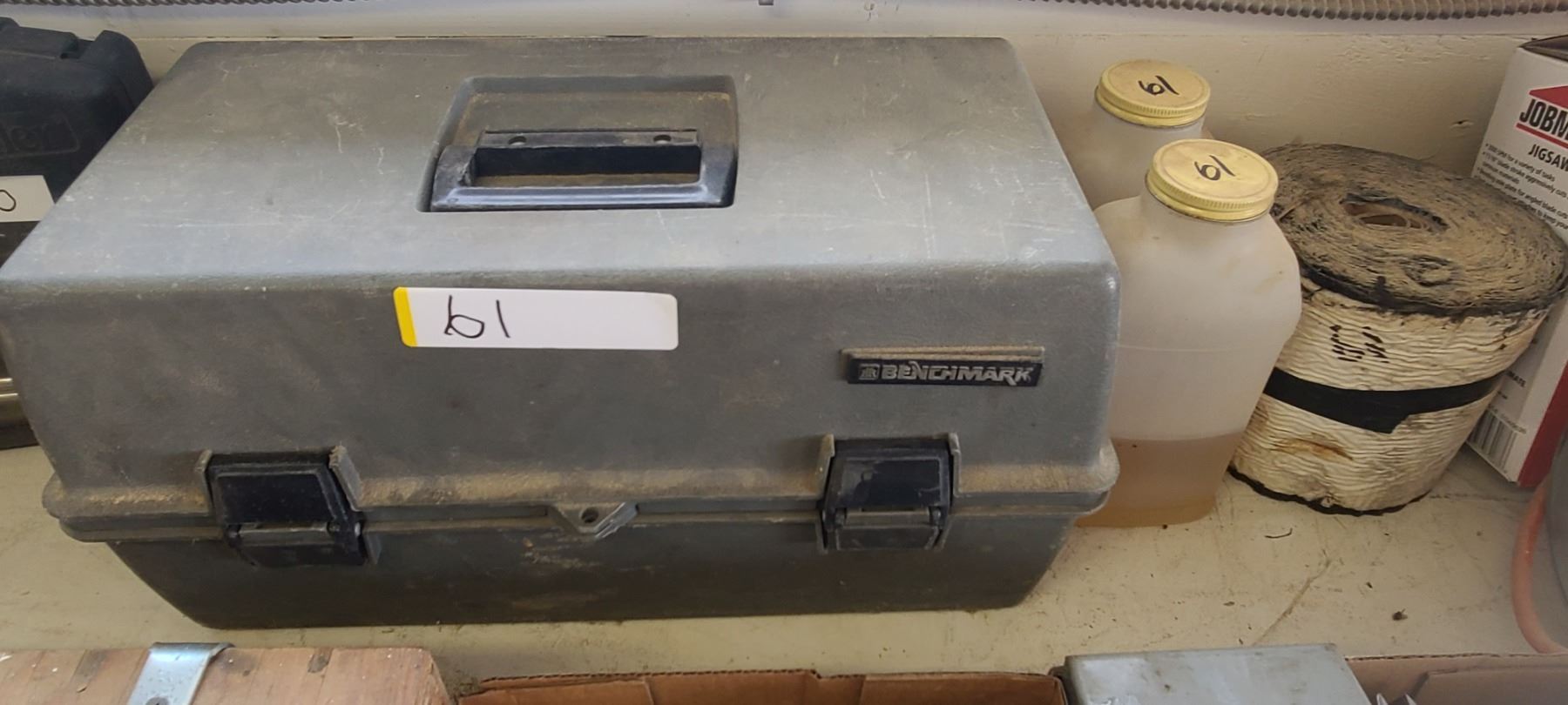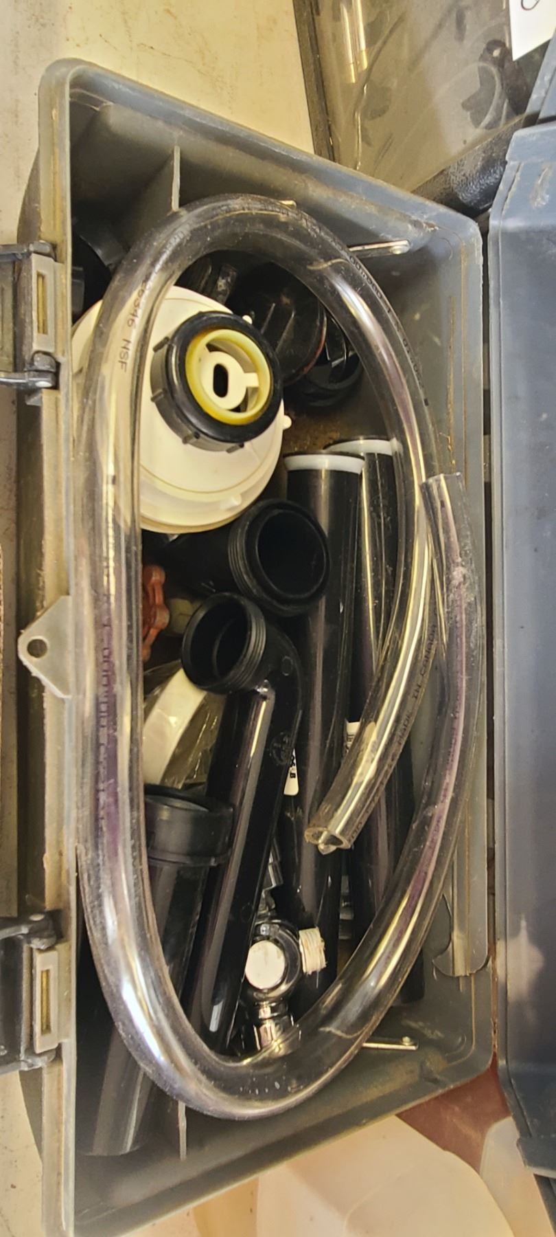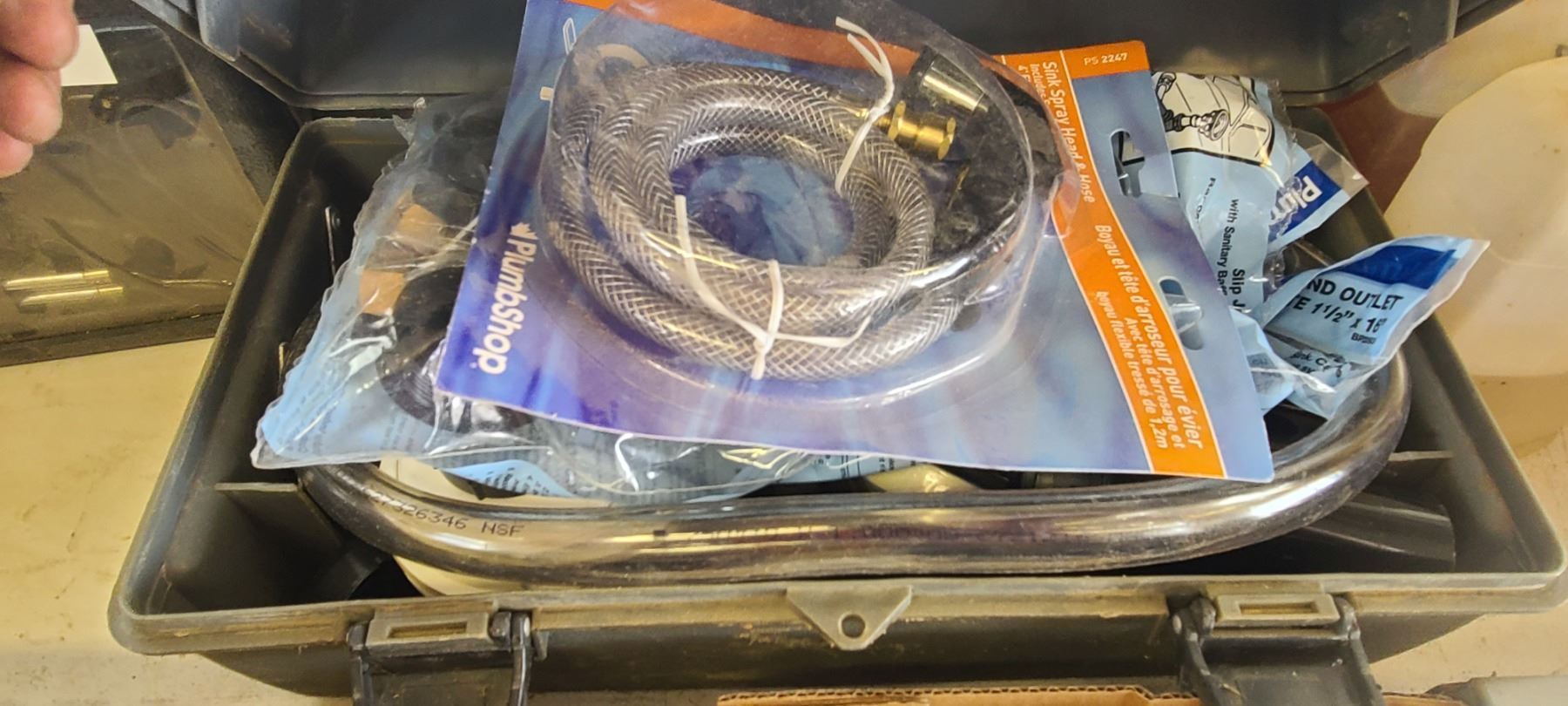 TOOL BOX WITH ASSORTED PLUMBING PARTS, OILS AND TAR SEAL