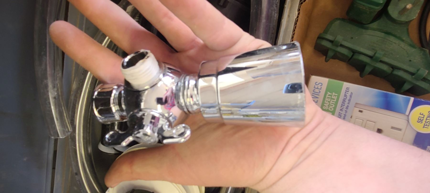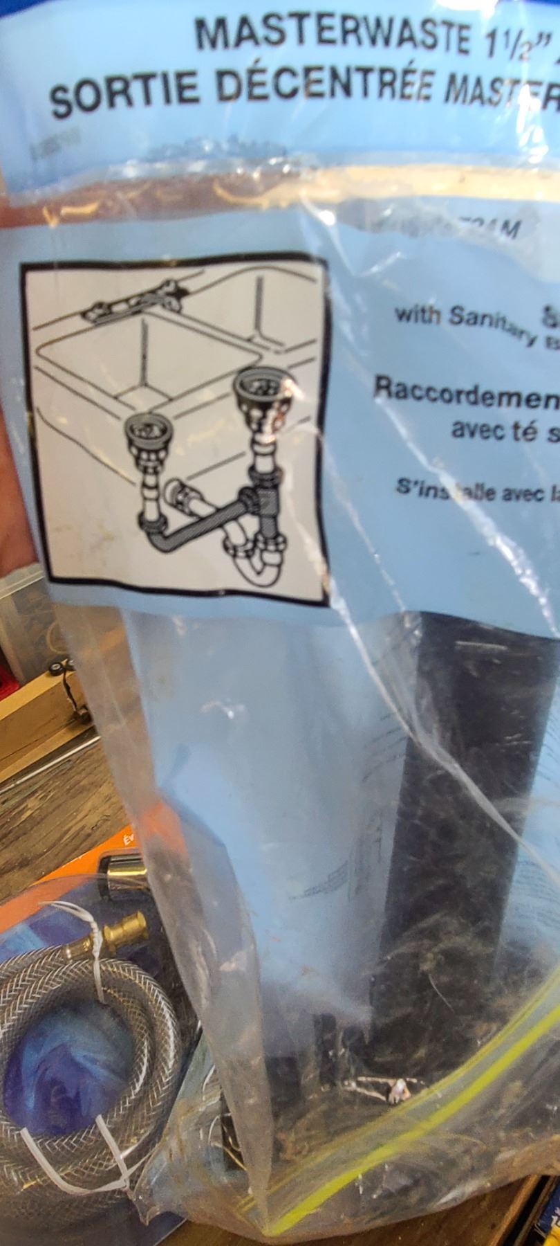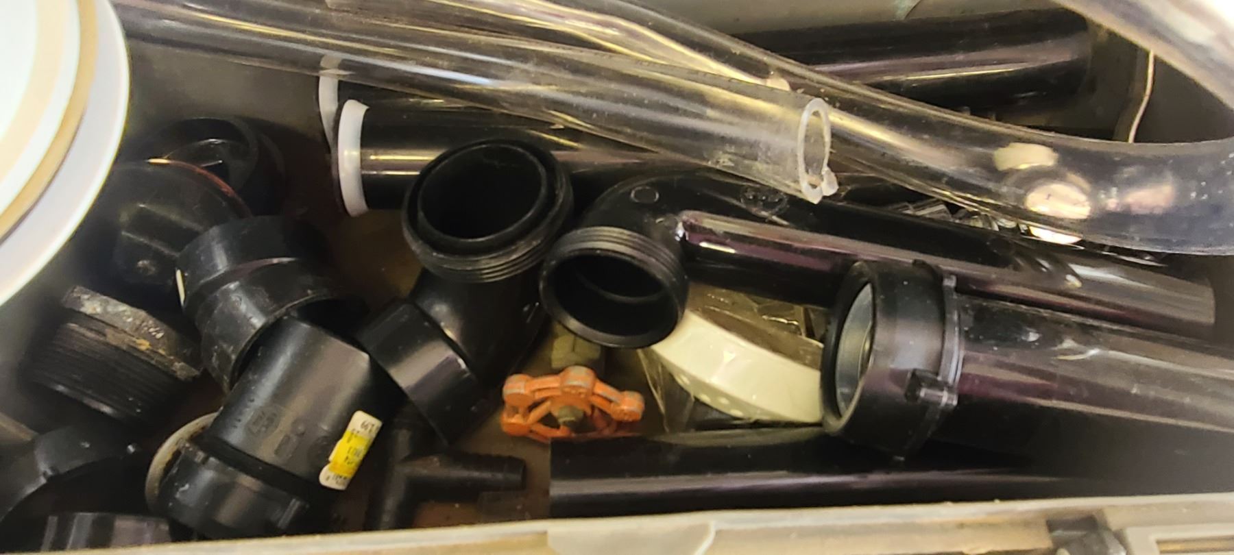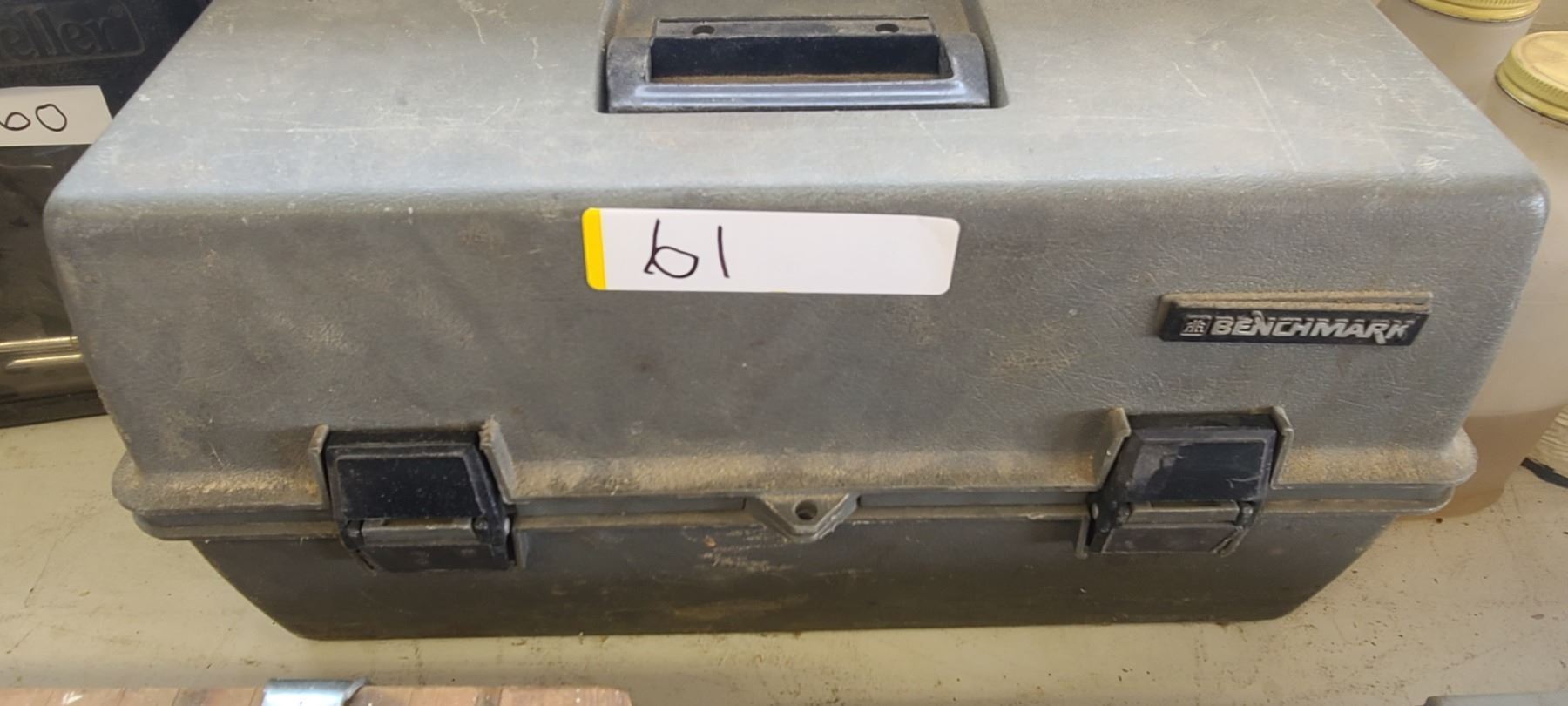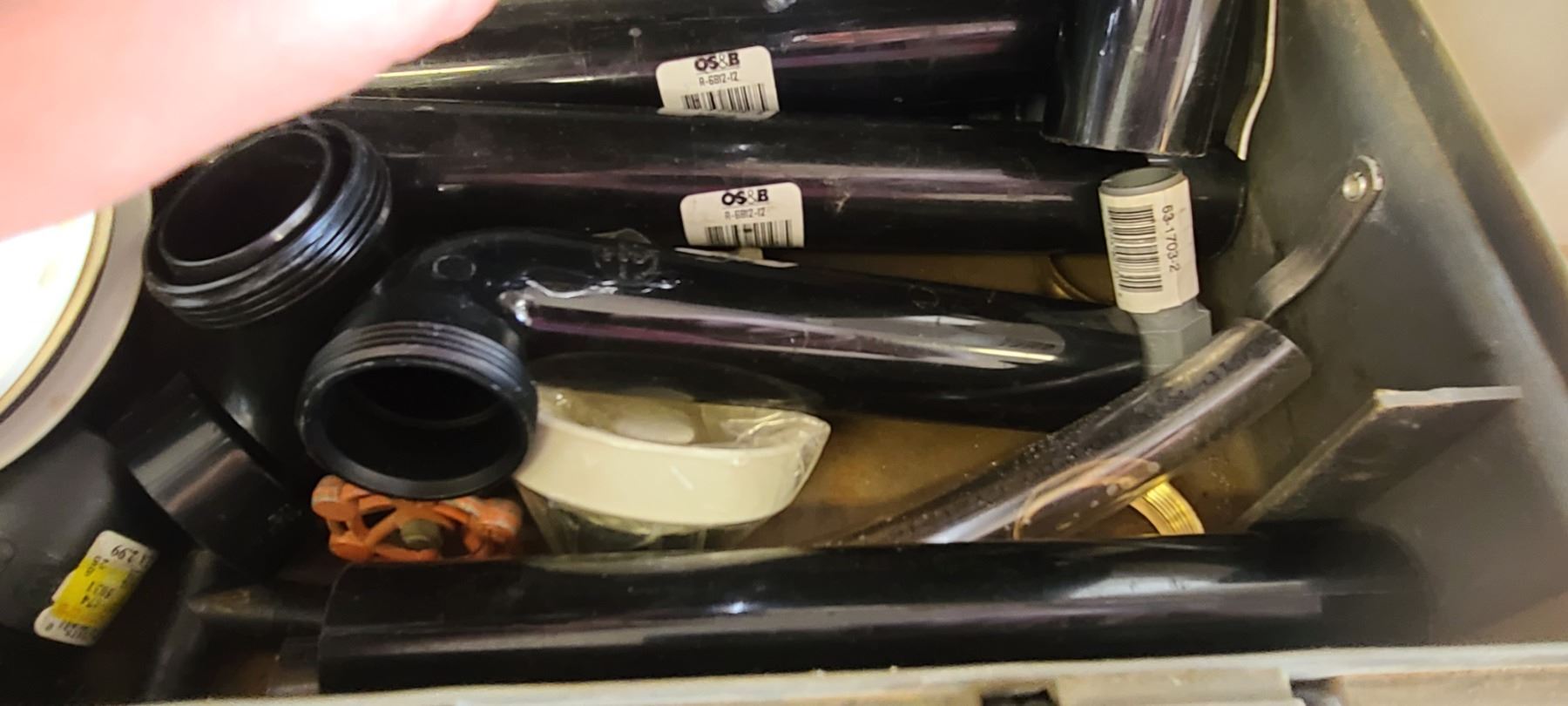TOOL BOX WITH ASSORTED PLUMBING PARTS, OILS AND TAR SEAL