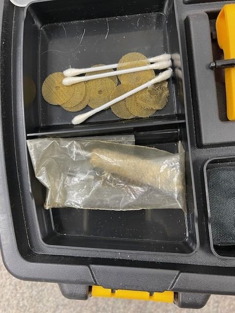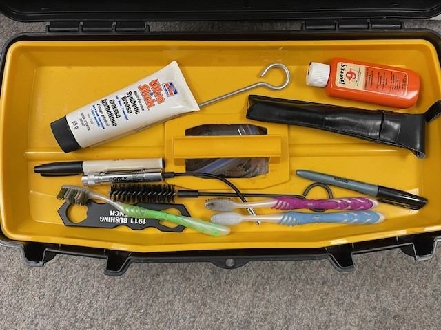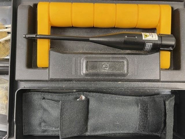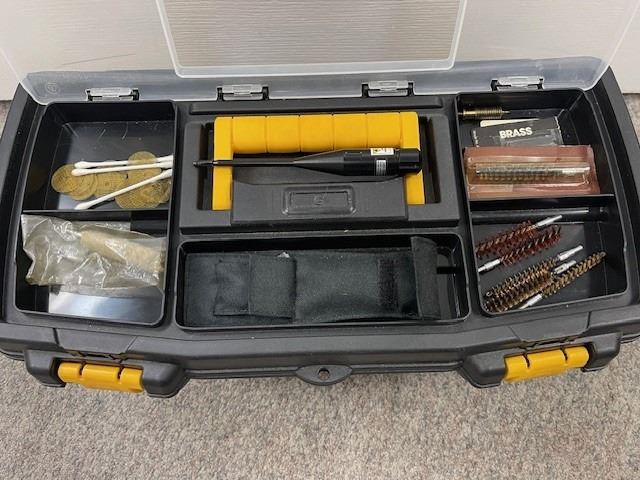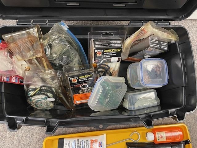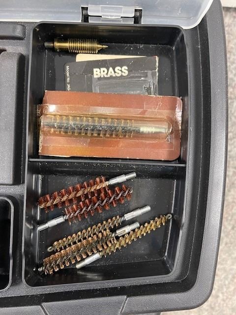 BOX CONTAINS ASSORTED BRUSHES, BORE SNAKES FOR VARIOUS CALIBERS AND ASSORTED CLEANING SUPPLIES