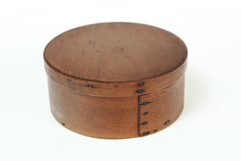 American, late 19th-20th century. Large carrier with cutout handle and old red paint, 12"h. 30"w. and two round bentwood pantry boxes in natural finish. One is modern with maker's label. 3"h. 7"d. 3"h. 8"d. Together with a set of pine shelves. Three simple floor shelves with old worn yellow paint, 32"h. 37 1/2"w. 8"d.