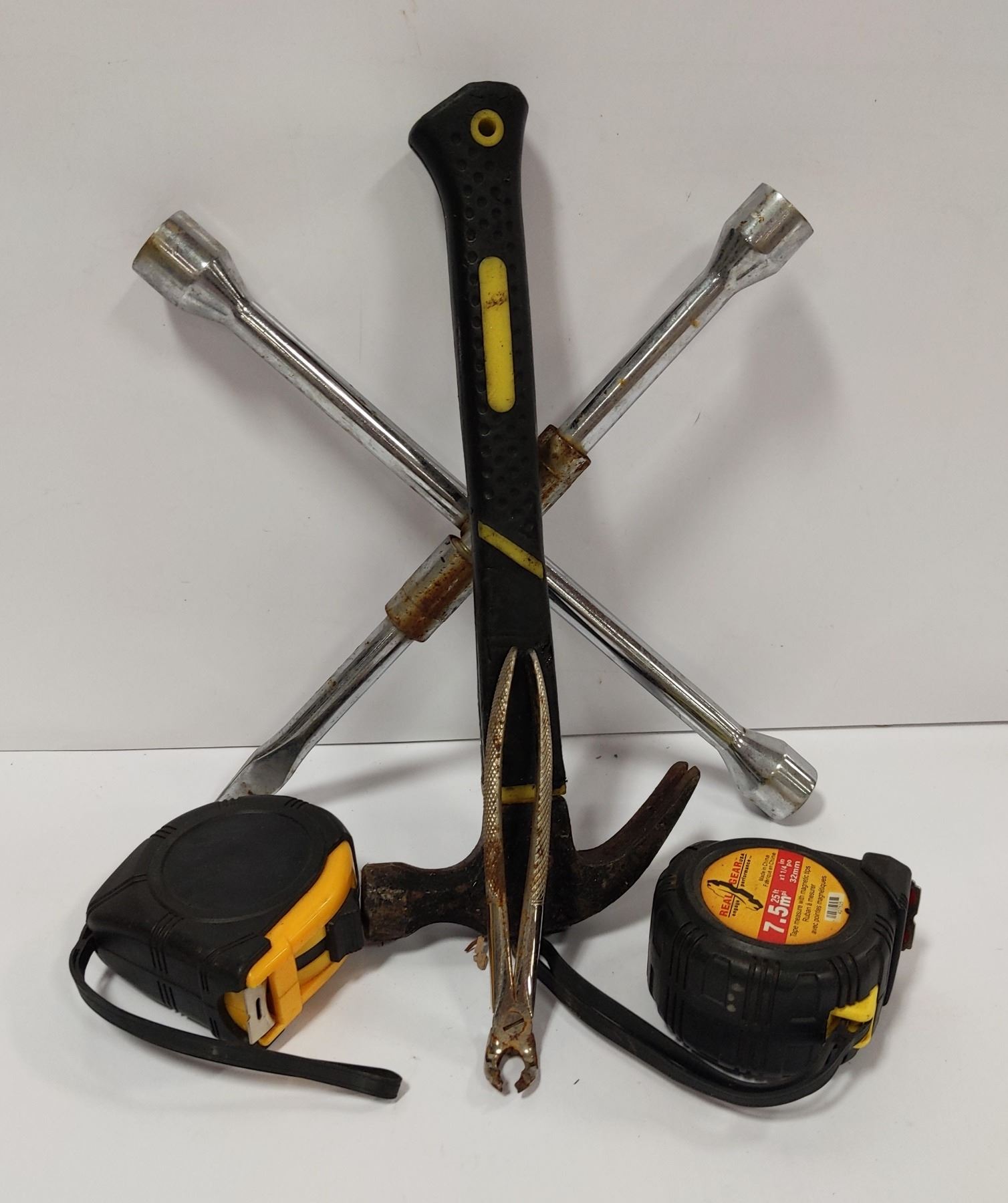 TOOL LOT: TIRE IRON, HAMMER & 2 TAPE MEASURES